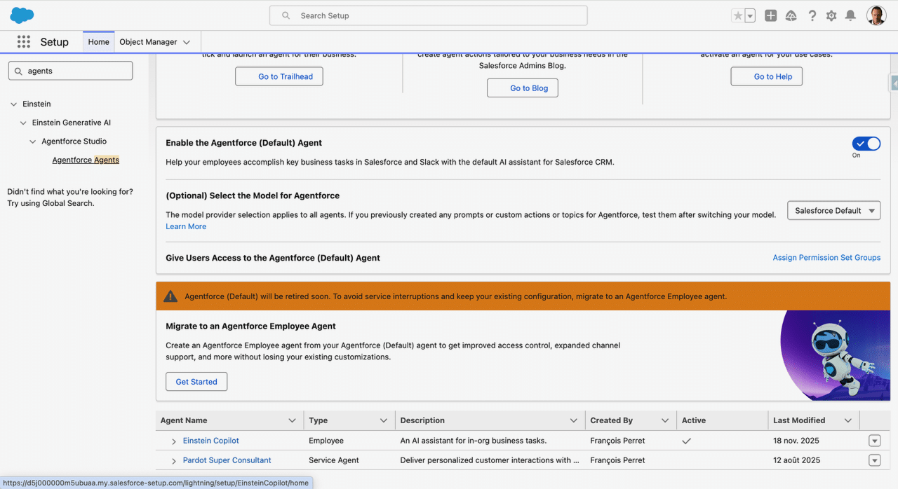 If you previously activated Einstein Copilot, and added the Campaign Creation and Content Creation to it, along with their related actions, you should be prompted to migrate to Agentforce employee agent. You simply trigger the migration using the Get Started Button.