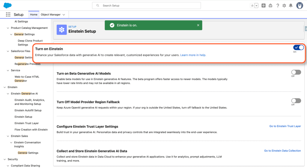 If not already done, go to Setup > Einstein > Einstein Generative AI > Einstein Setup and Turn On Einstein. Leave other elements on the page as-is.
