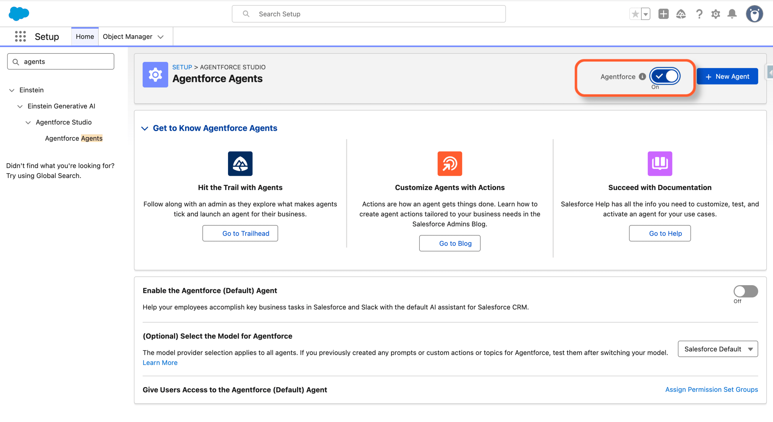 From Setup > Einstein > Einstein Generative AI > Agentforce Studio > Agentforce Agents and Turn Agentforce On.