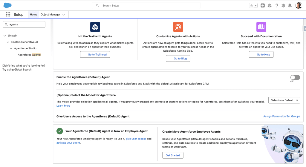 This will create a new Agentforce Employee Agent, embedding the same Topics. You can now remove those Topics from the newly created Agent, and follow the steps to create the new agents below. You may then deactivate Copilot by changing Enable the Agentforce (Default) Agent to Off. You should see “Your Agentforce (Default) Agent is Now an Employee Agent”.