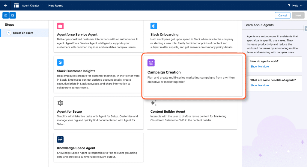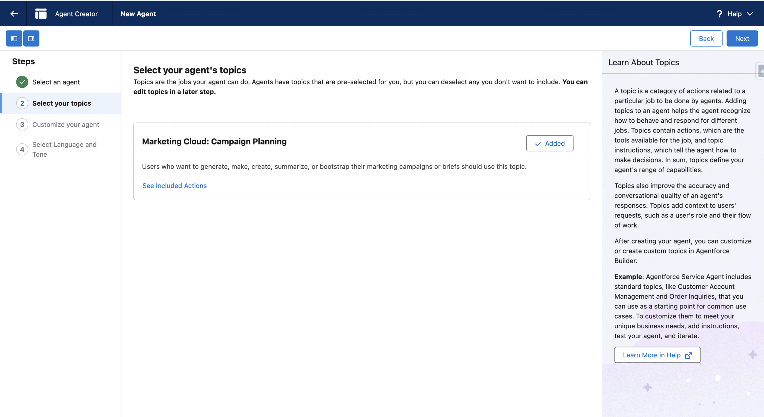 Next. This Agent contains the “Marketing Cloud: Campaign Planning” Topics and its relations action. This Agent template is for “Users who want to generate, make, create, summarize, or bootstrap their marketing campaigns or briefs should use this topic.”.