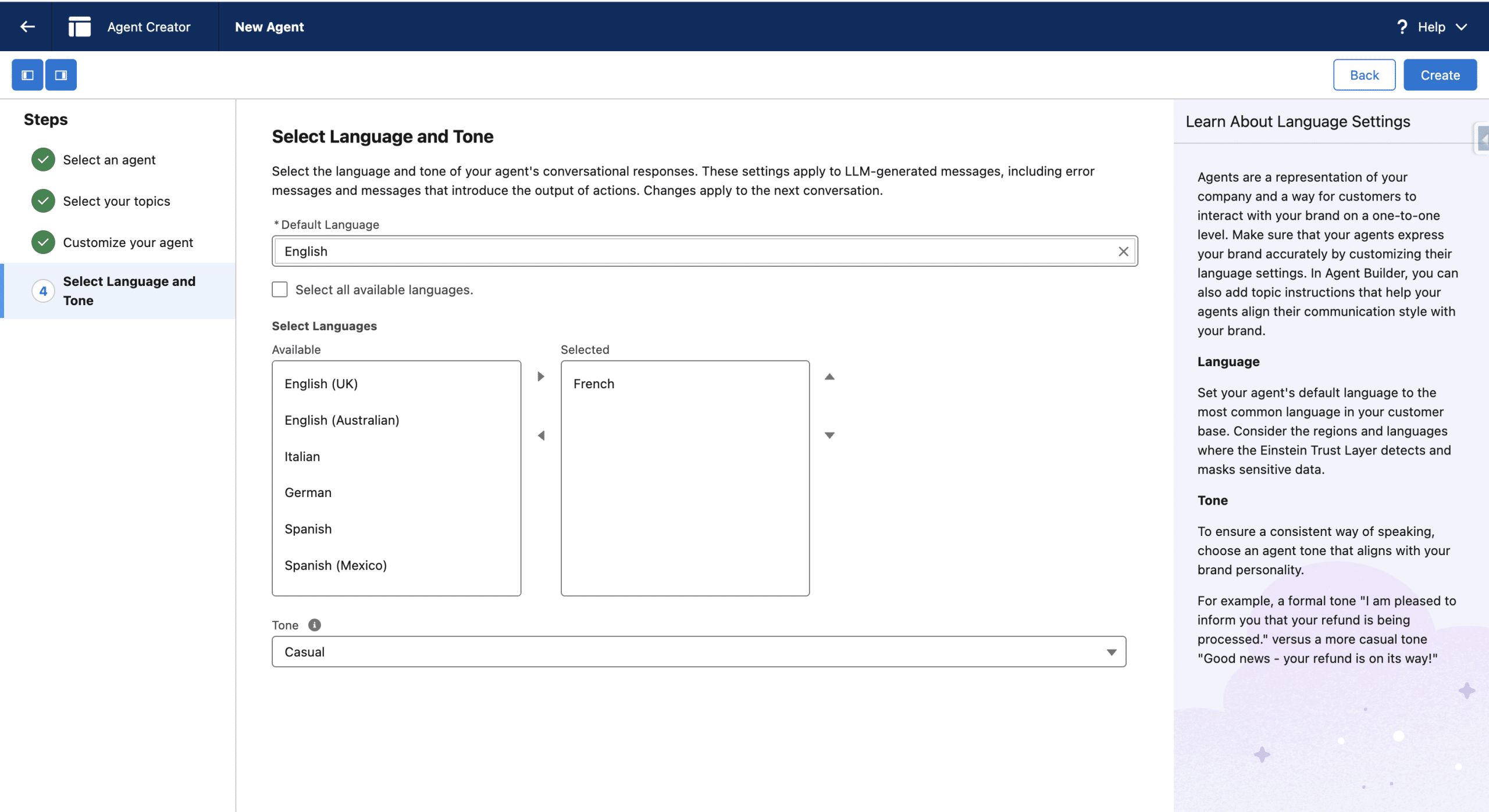 Then, select which languages your Agent can handle and the default Tone to use. Create. You agent is now Created and you are redirected to Agent Builder. Click Activate (you don’t need to add a knowledge library to this type of agent) so your Agent can be used. Before it is available, we’ll need to allow its use using a Permission Set in a following step.