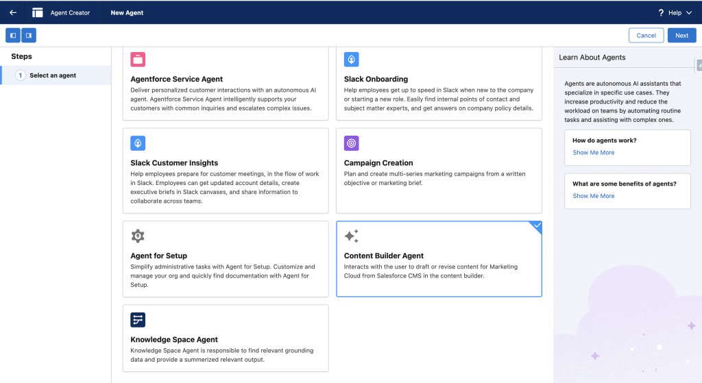 The procedure to install this Agent is similar to the previous one, we just select another Agent Template as a starting point: the Content Builder Agent. From Agentforce Page, New Agent.