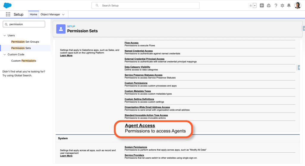 One of the main difference between the previous version of in-org Agents (Copilot) and Agentforce Employee Agent is that you define who can access them thanks to a Permission Set (preferred method to the Profile based one). We’ll create one Permission Set to give access to the two new agents, but you could create one Permission Set for each Agent to have a more granular control.