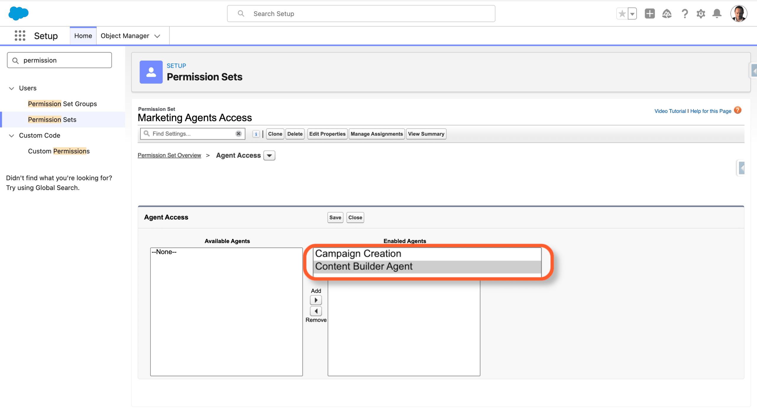 Setup > Permission Sets > New (or use an exisinting one), and give a name to it, like “Marketing Agents Access”, then Save.