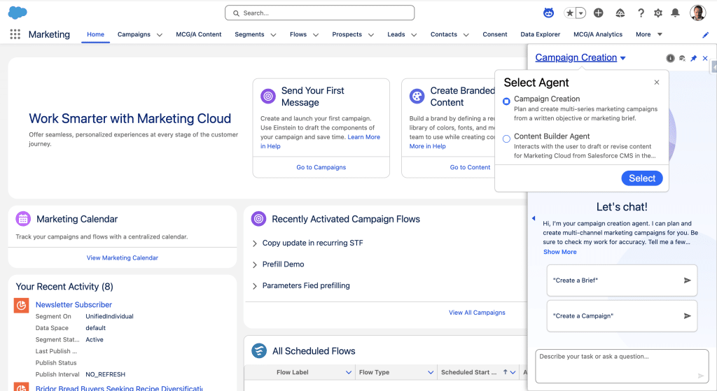 We now have the Campaign Creation Agent and the Content Creation Agent (these are the default names). From the Homepage of the Marketing App, you can click on the Agentforce icon and you will be presented the option to select the Agent you want to use.
