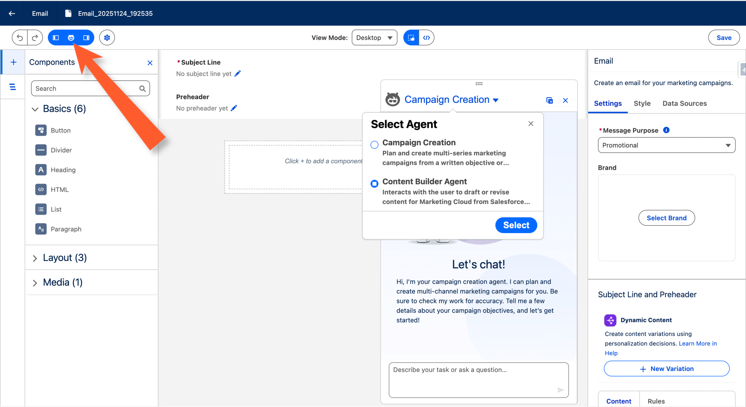 That Agent is to be used within the Content Editor (Email, Landing Page, WhatsApp messages, etc.). The Campaign Creation should not be used from within the Builder. From the Builder select the Agentforce icon on the top left, which opens a new window, where you can add content from a prompt. Previously, a sparkling icon on a Canvas component was to be used. Click Content Builder Agent and then Select.