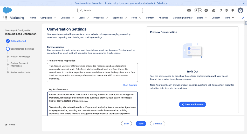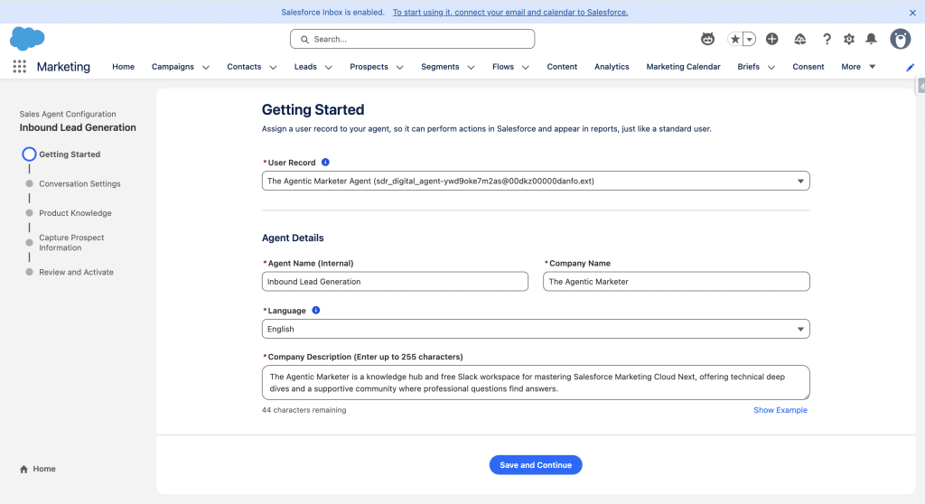 The User Record should already be created, so you’ll need to define the Agent’s Internal Name, your Company Name, the default Language (other languages can be added later in Agentforce Builder) and a Company Description. Once done, click Save and Continue.