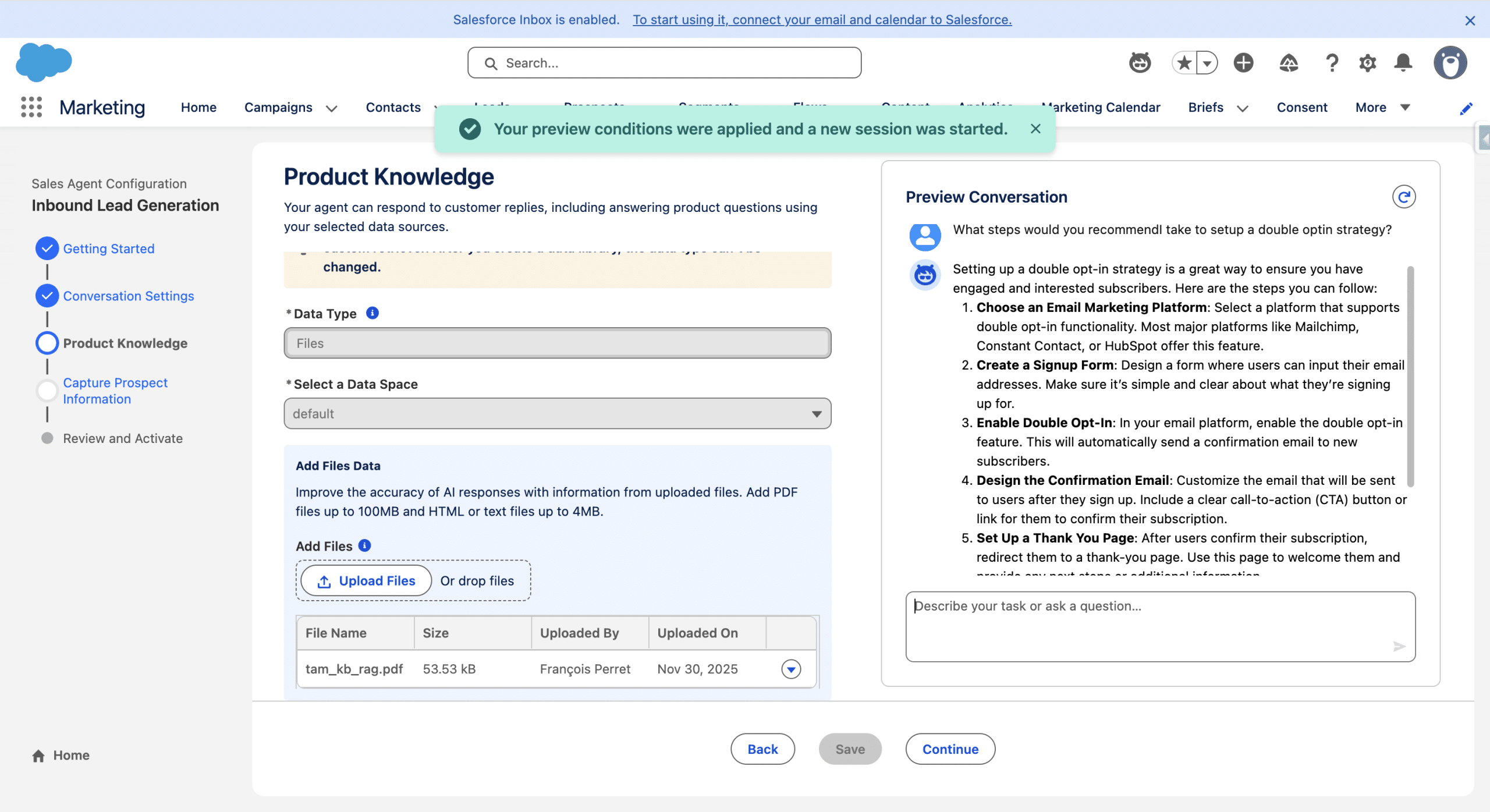 So far, the Agent has little knwoledge of youyr Company. You can however click Save and Preview to start chatting with your Agent. Once done, click Continue.