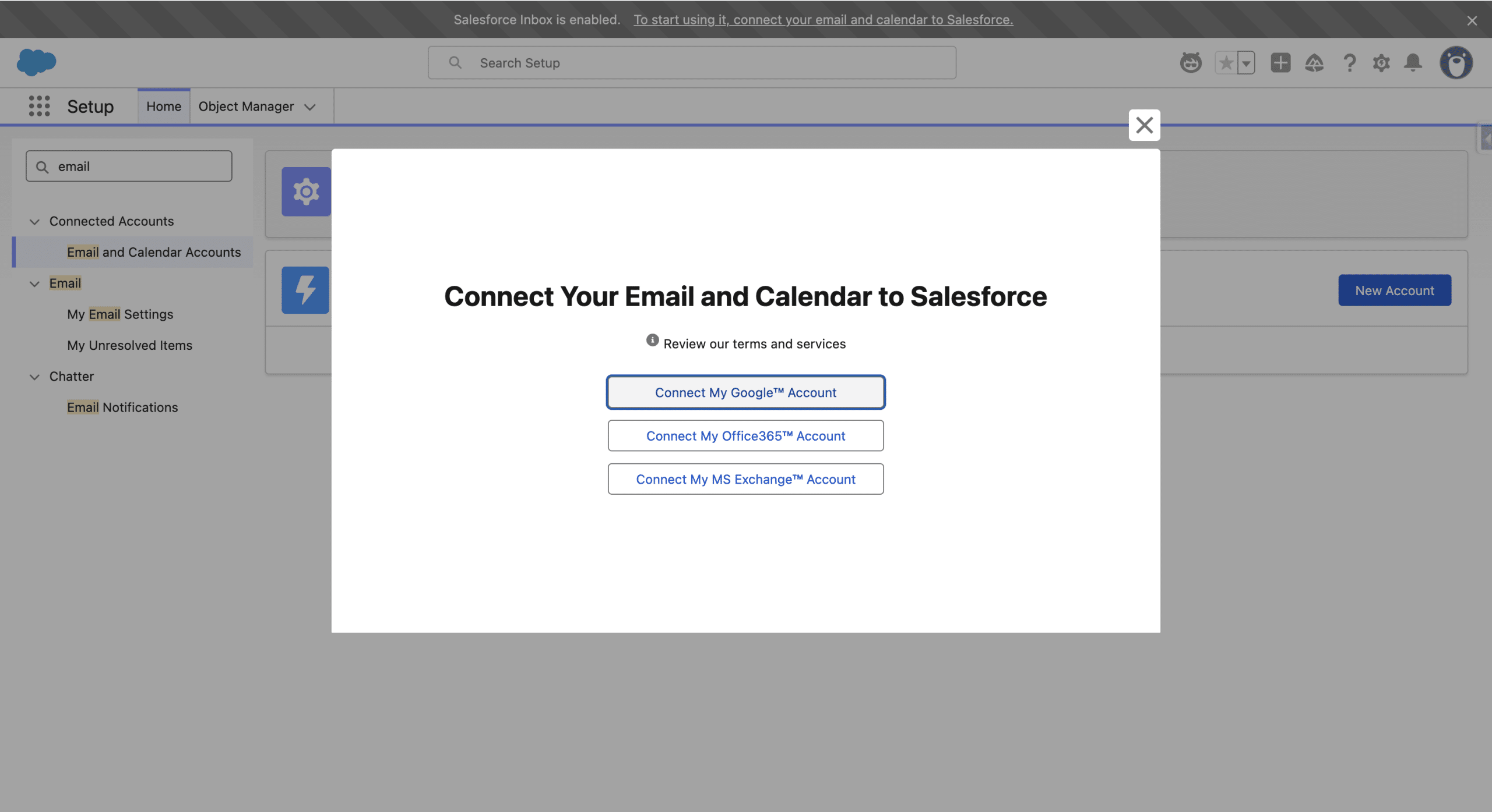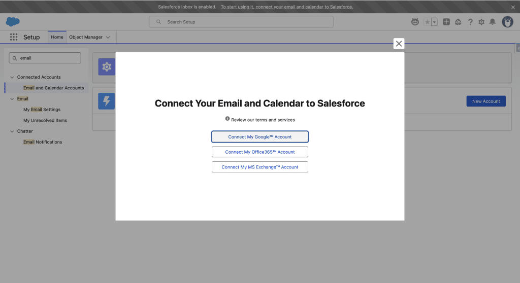 If you don’t have an Inbox user, you’ll need to create one. Salesforce Inbox ties a Salesforce User to an external Inbox (Gmail, Office 365 or Exchange), to read and write new Emails as well as create Calendar invites on behalf of the tied user. You should see a toast stating “Salesforce Inbox is enabled.To start using it, connect your email and calendar to Salesforce.”, if not click your user avatar and search for Email and Calendar Accounts. Connect Account, then check “I’ve read and understand these terms.” and Next.