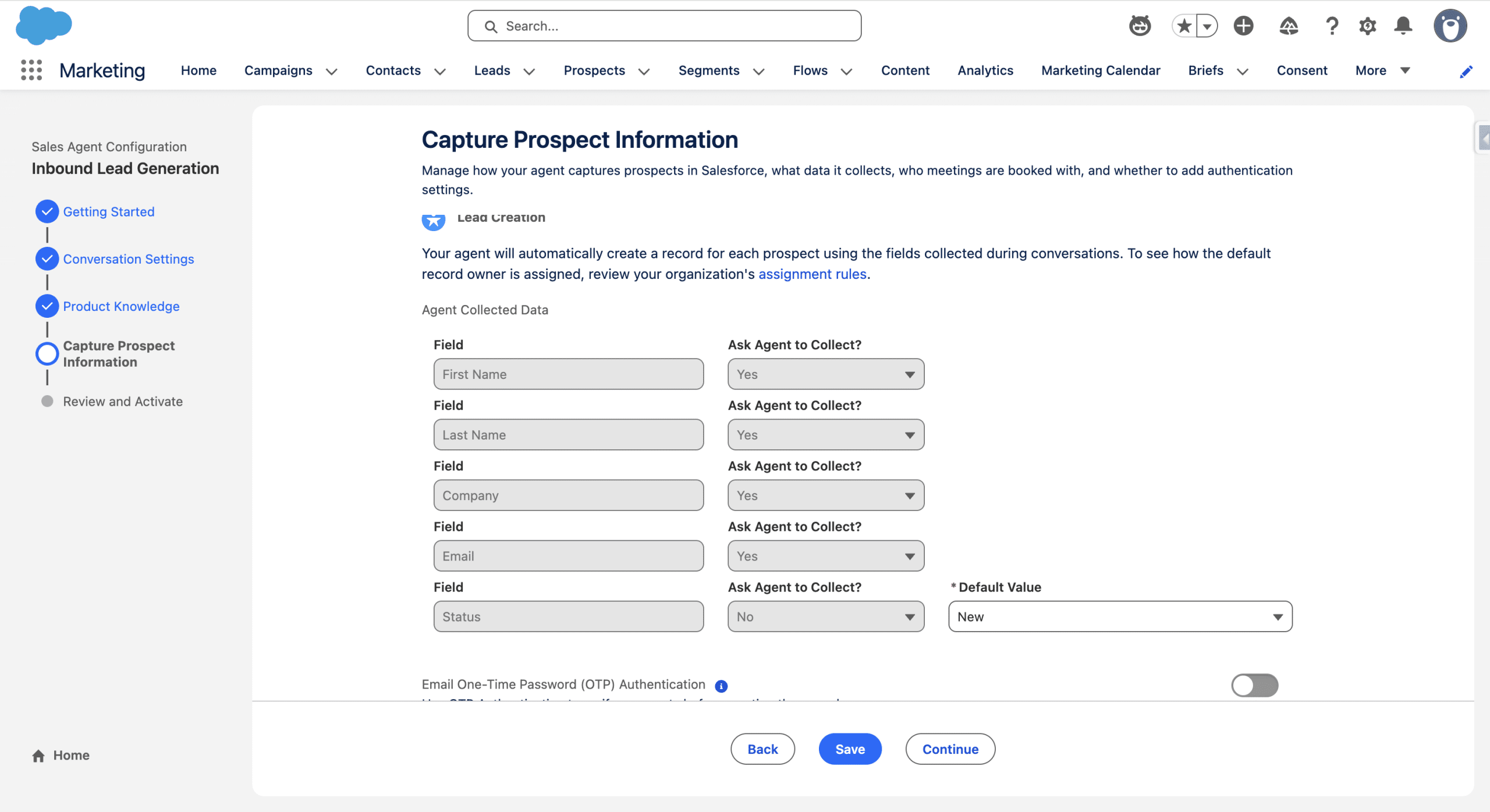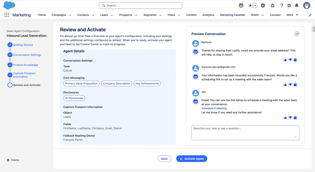 In this fourth step of the wizard, we’ll define what informations are needed to create a new Prospect record, along with the type of Record we want the Agent to create. We keep the default Lead creation and set the Status to New (You can define which fields should be captured by the Agent in the Chat). In Meeting Scheduling, we use the Connected account (Inbox User) we defined on step 3.