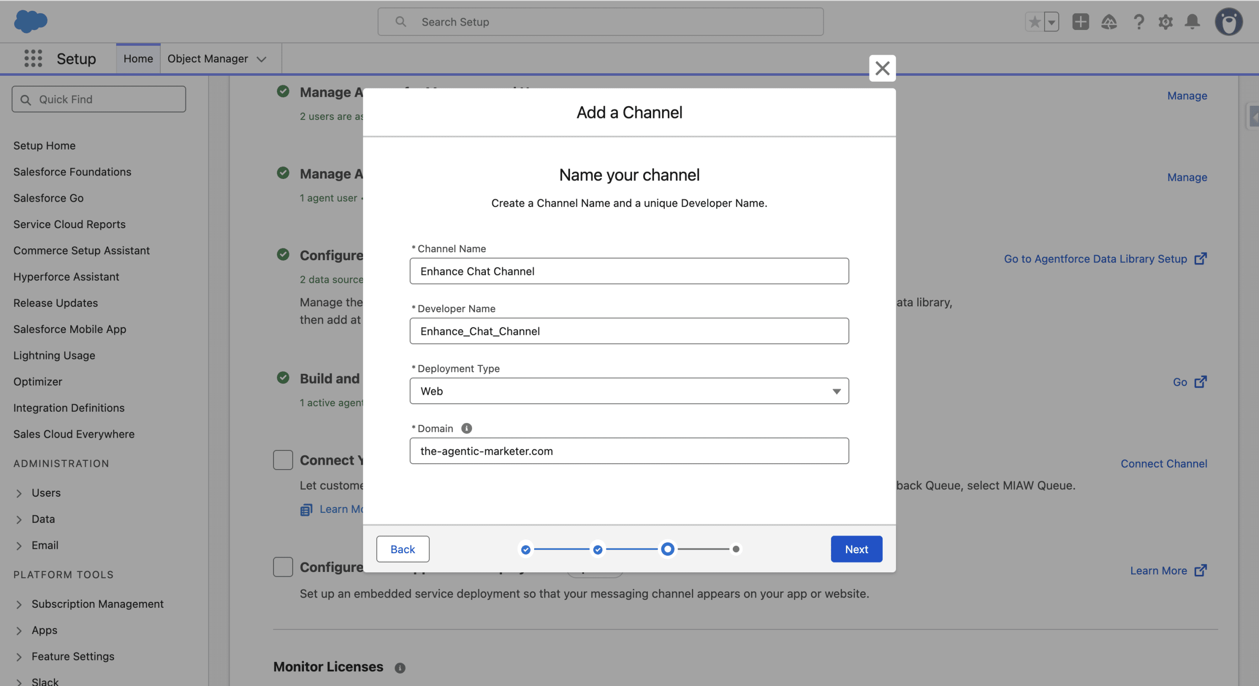 From the Agentforce for Sales setup page, we click Connect Channel and Start. When presented with a list of native Channel, we select Enhanced Chat.