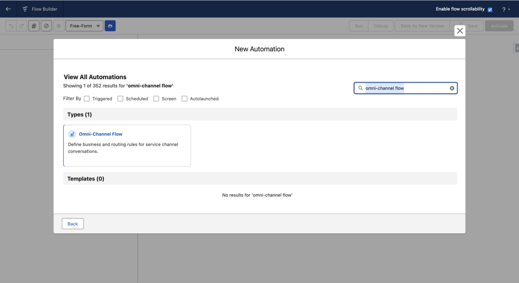 We’ll create a simple Omni-Channel Flow to route conversations and messaging sessions to our Agent. Setup, Flow, New and Search for omni-channel flow.