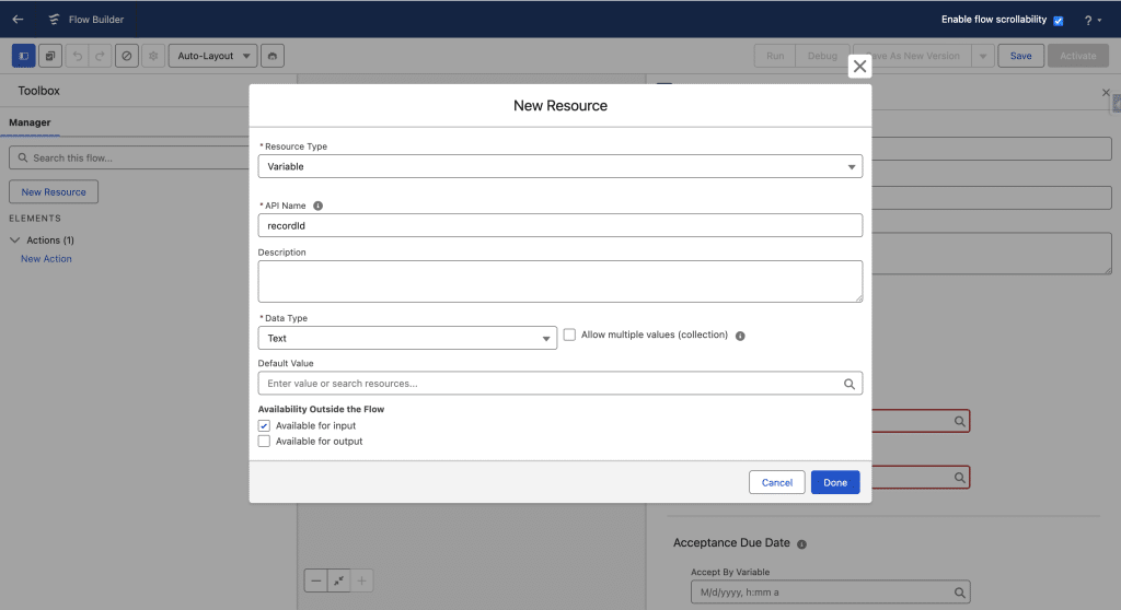 Click the Omni-Channel Flow to create a new Flow. We then add a Text input Variable, recordId, which the Flow caller will set with the current Messaging Session Id.
