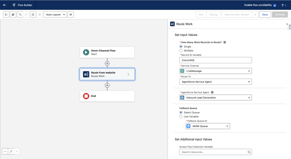 Available for Input must be check. Done. Next, we add a Route Work element to the Flow, give it a Name, we’ll define the Single work record to route with the input Variable we just defined. For the Service Channel, we select one that is related to the Messaging Session Salesforce Object. For Route To, we’ll select Agentforce Service Agent and select the Agent we created earlier in Agentforce Service Agent. Finally we set the Fallback Queue to MIAW Queue (MIAW stands for Messaging for In-App and Web).