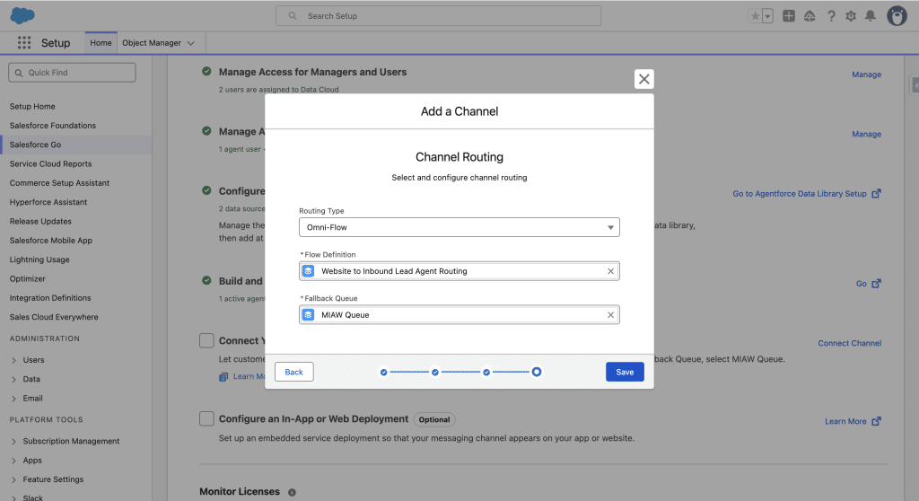 We give the new Channel a name, keep the default Web deployment type and specify the Domain we want to host the Agent into. Next. We then select the Omni-Flow routing type, and in the Flow Definition we choose the Omni-Channel Flow we created in Step 5.1 (you need to input the first letter of the Flow Label). For the Fallback Queue, we select MIAW Queue.