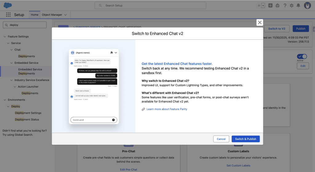 Setup, search for Embedded Service Deployment and Open the Deployment we created in step 5.2. Click Switch to V2, which is the latest version of the Chat window on the website.Click Switch & Publish. You’ll receive an Email once the V2 version is activated. In this Version, the Chat button on the website displays “Ask Me Anything” and the Chat window is larger. From the same Embedded Service Deployment Settings page, you’ll find: