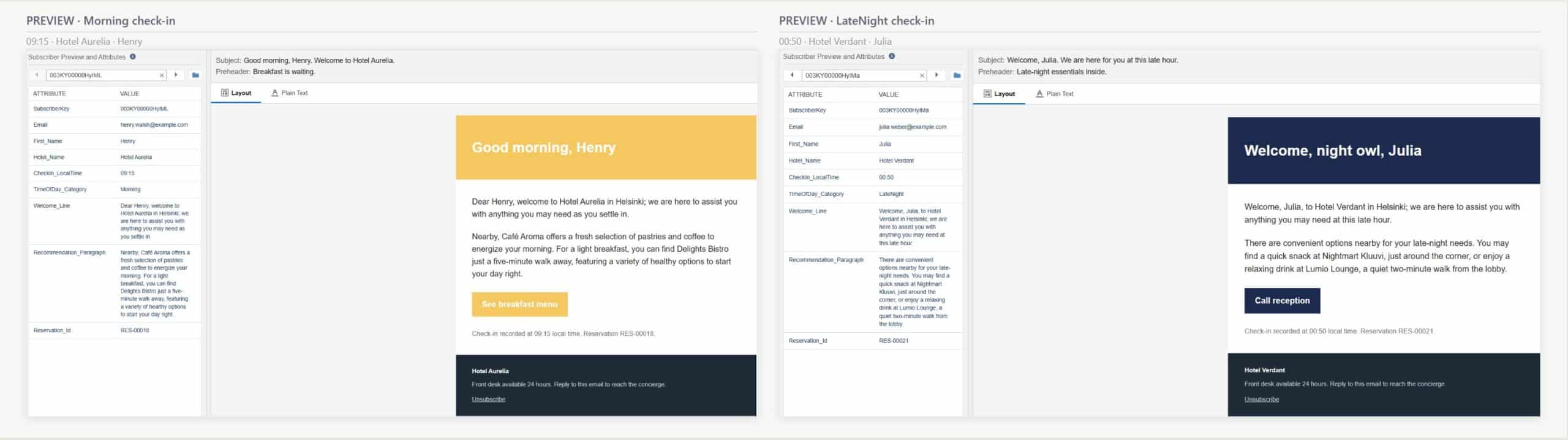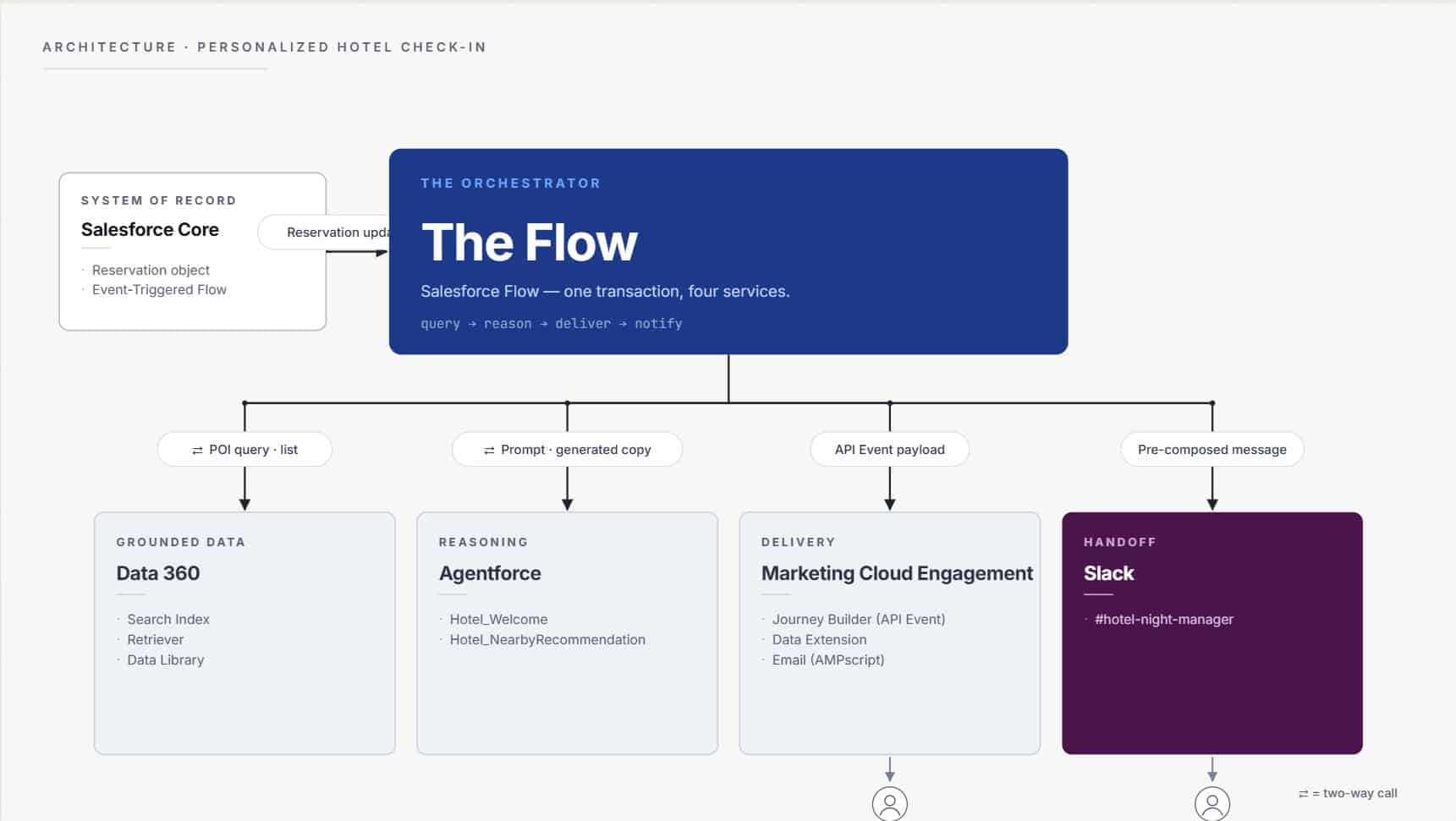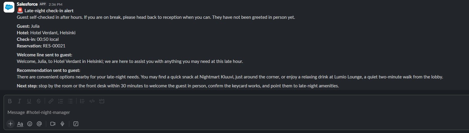 Executive summary: A hotel guest does a self-check in in the middle of the night. Tired after a long flight, they want a bottle of water and a quick snack before bed. Within seconds their phone vibrates with a personalized email that greets them by name, references the hotel and the hour and suggests a 24 hour corner shop and the deli that are still open at this hour. In the same second the reception’s Slack channel lights up with a reminder that a guest has arrived and a preview of what the guest just received. One transaction sets up a seamless chain of events across Salesforce Core, Data 360, Agentforce, Marketing Cloud and Slack. Elements included: