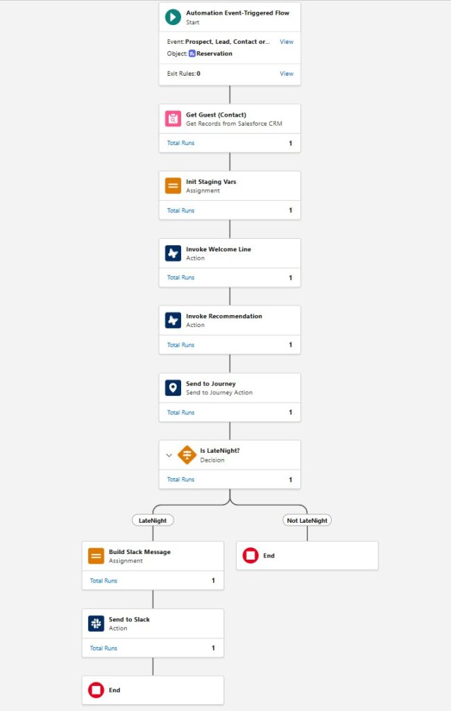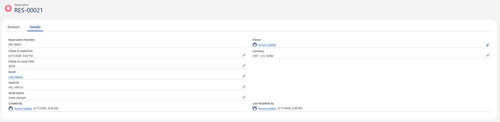 Everything starts with a check-in timestamp being inserted into a Reservation record in Salesforce. Guest, hotel and nearby services are already linked to that record. Nothing special, same kind of setup that applies to many industries.