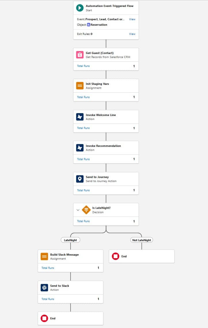 The journey in my demo is intentionally extremely simple. The demo is about the orchestration between Flow and MCE, not journey complexity. A journey with multiple channels, waits and decision splits is built exactly the same way. Want to add an SMS or Push notification to late night arrivals? A landing page with a breakfast menu for early mornings? Bus or train schedules for checkouts? Each of these additions becomes trivial once the foundation is in place. They aren’t new projects. The setup that took time to build is already there.