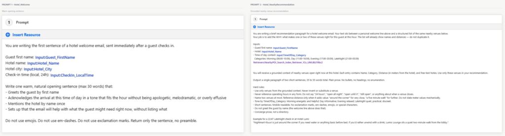 Grounded reasoning belongs in Prompt Templates. Writing a welcome line in a tone that fits the hour or turning a messy free-text Notes field into a concierge recommendation is a context-dependant judgement task. There is no deterministic rule that writes good copy and even if you tried a rule-based approach here you would have to build hundreds of template variants and rulesets. The LLM only ever gets to reason over data that has already been filtered and grounded upstream.
