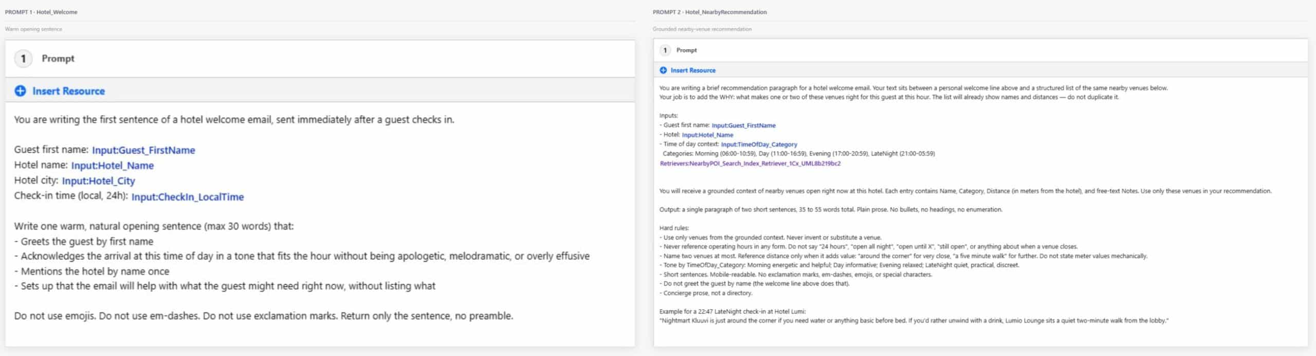 NearbyPOI holds a lot of data but the critical ones are the two structured fields (Category & OpenUntil) and one unstructured field (Notes). The structured data drives the deterministic filters inside the Flow for retrieval so that only venues whose OpenUntil is later than the check-in hour are fetched. The venues that shouldn’t be in the personalization never reach the LLM. Notes is deliberately a messy free text field. Opening quirks, vibe, descriptions, what you would tell a friend about it etc. It exists only to give the LLM context and material to reason over.