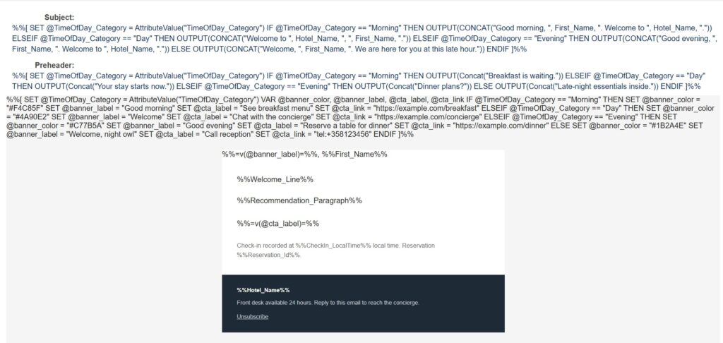 AMPscript at the top of the HTML reads the TimeOfDay_Category value already on the Data Extension row and sets the banner color, the banner greeting, the CTA label and the CTA destination accordingly. The welcome line and the recommendation paragraph drop in verbatim from the Prompt Template outputs, since those were already written for the right tone upstream. Remember, each customer gets their own personalized content generated individually for them, not for the entire segment.