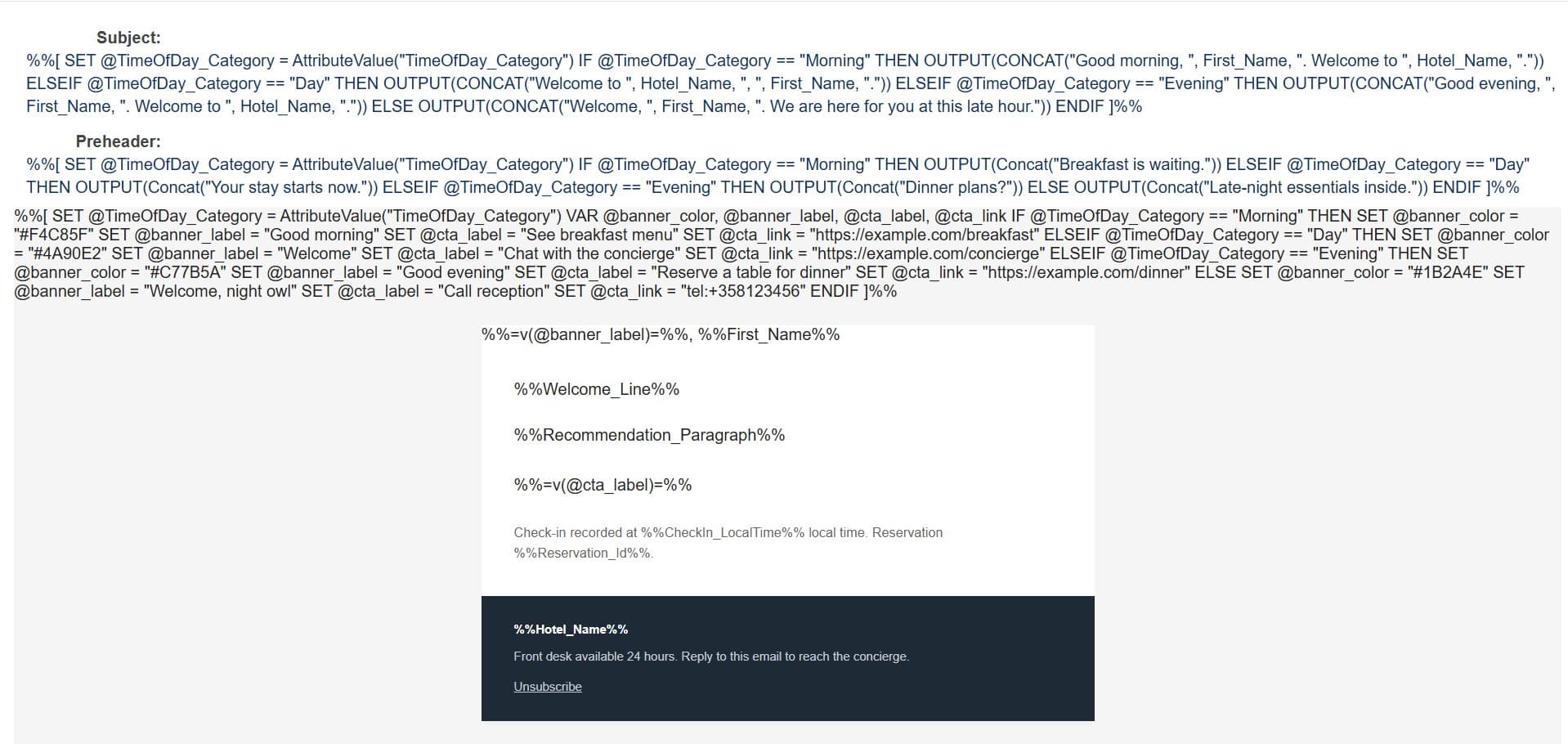 The welcome template takes the guest’s first name, the hotel, the city and the local time and returns a single sentence that greets the guest in a way that fits the hour. That’s it.