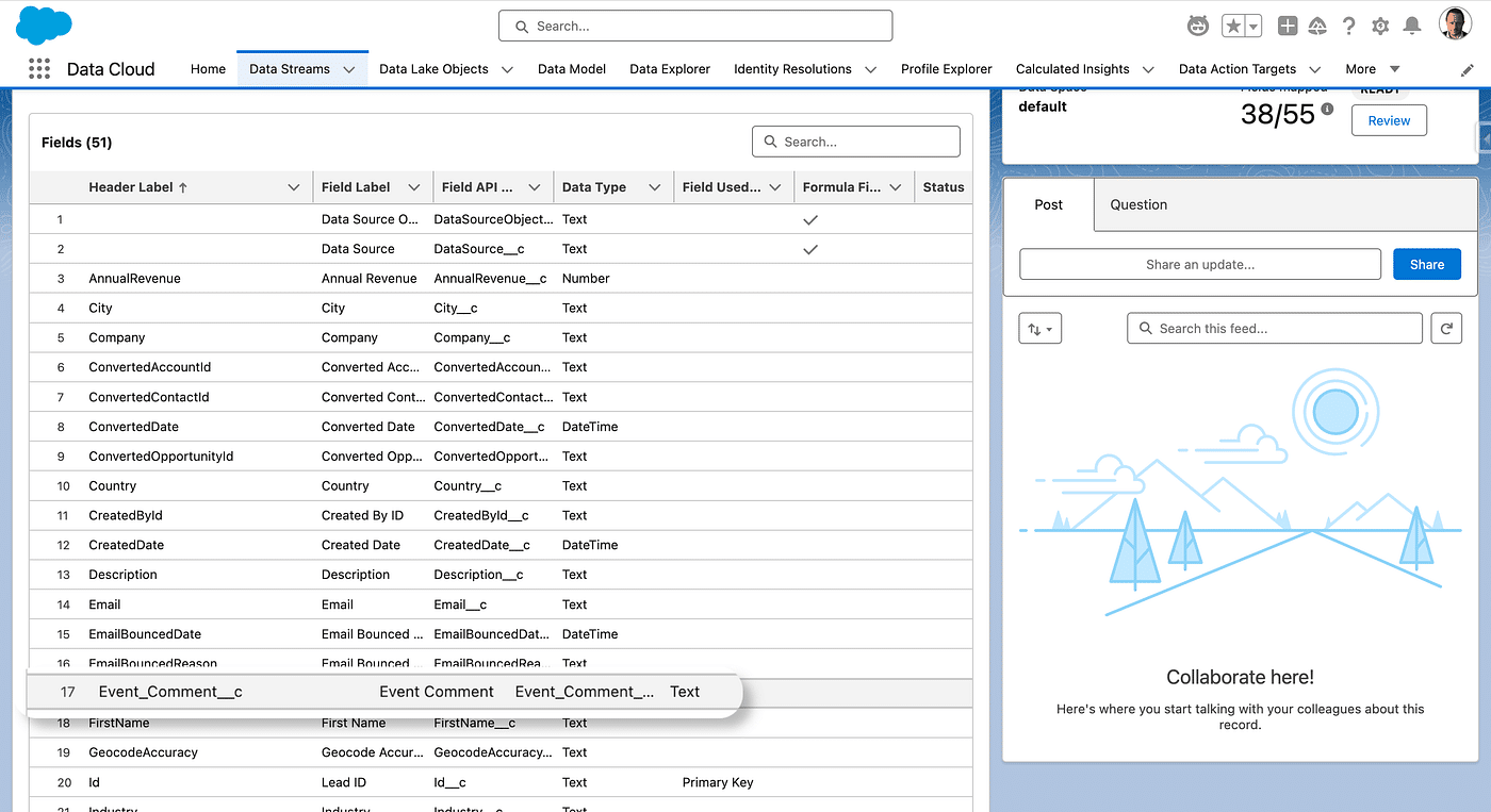 We’ll call it Event Review, or whatever name you like (even Event Comment, same as the original Field), and use a Text format for it. Then we click on the original field on the left side (DSO) and on the new Field on the right (Individual DMO) which creates a link betwen the two fields. Save the mappings, and now, whatever you add in the Event Comment in Salesforce will eventually be the value of Event Review in Data Cloud’s corresponding Individual.
