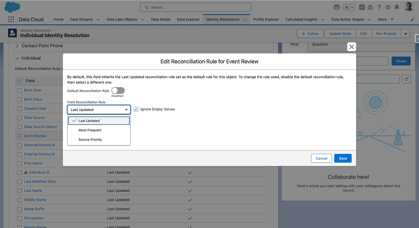 Finally, in case you have several Individuals (Prospects, Leads or Prospects), you need to tell Data Cloud Identity Resolution process which one to choose. This is done at the Reconciliation Rule level, which we discussed at the beginning of this article : there are 3 options once you leave the default DMO-based rule: