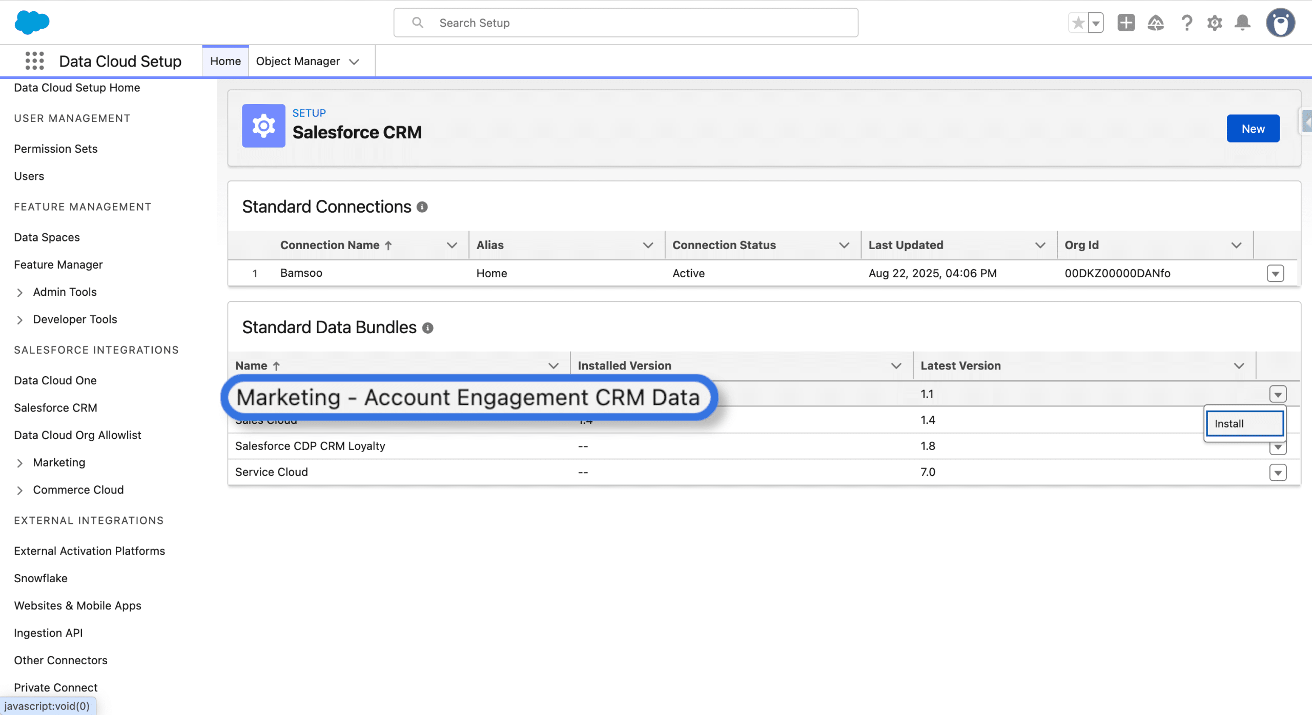 For this type of data, we’ll first need to install a Package for Data Cloud as Data Bundle. Let’s go to Data Cloud Setup > Salesforce CRM.