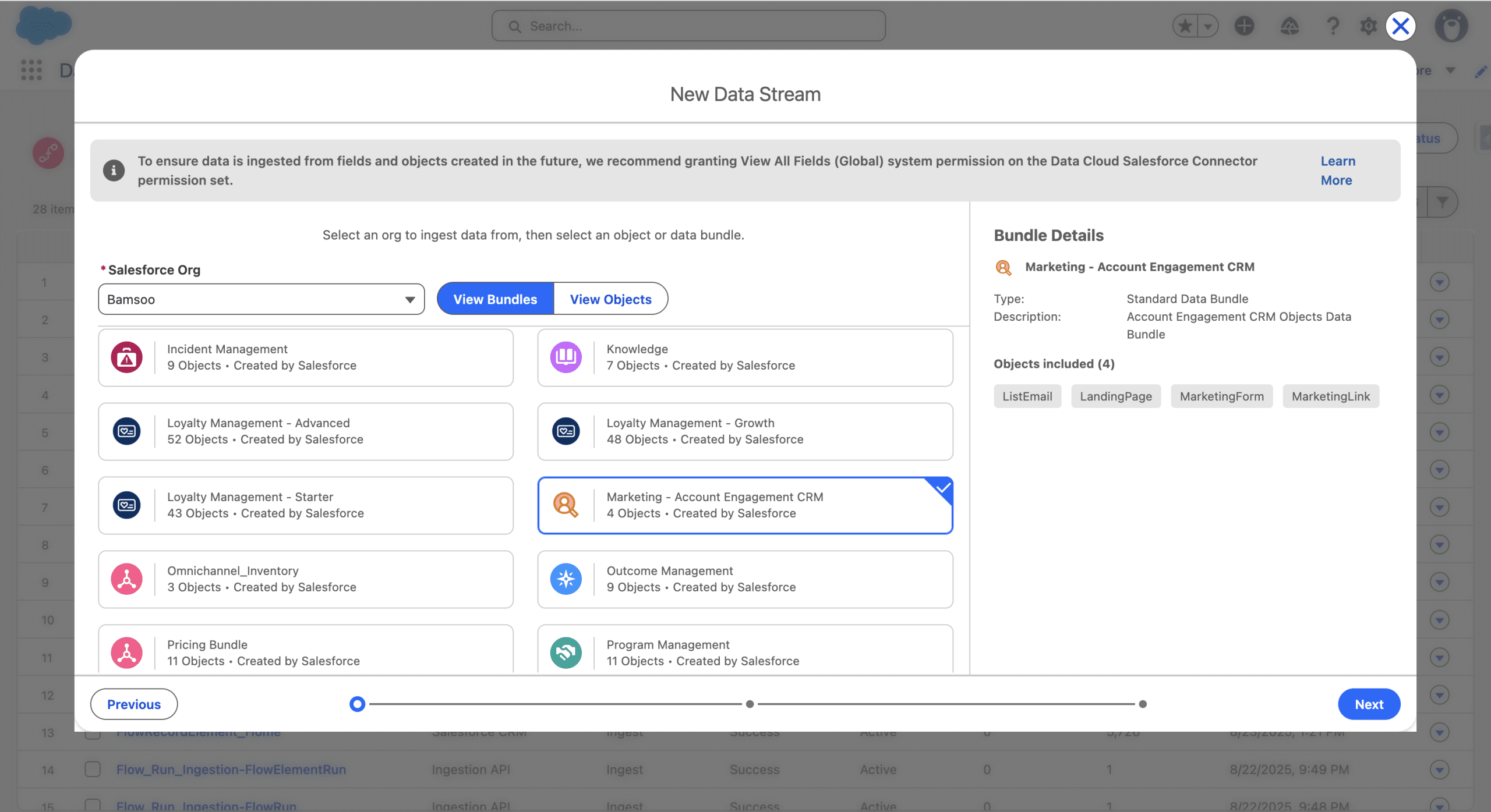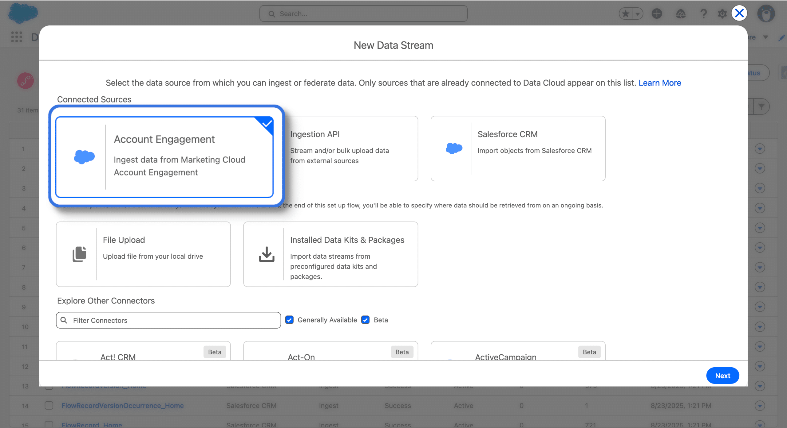 • An Account Engagement Data Source is now available in Data 360, which we will leverage in the following step