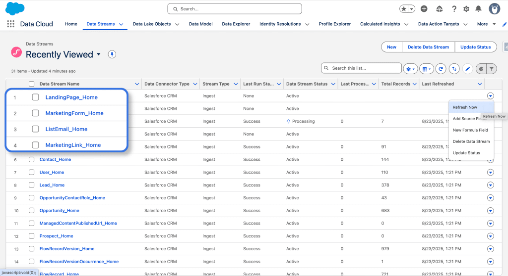 The name are self explantory and the first Data Stream is mapped to the Email Engagement DMO, the other ones are mapped to the Website Engagement DMO. This means your Prospect Activity Data from Account Engagement will participate to the Agentforce Marketing Score and be visible from the Data Cloud Profile Engagement component. This is Prospect Activity Convergence.