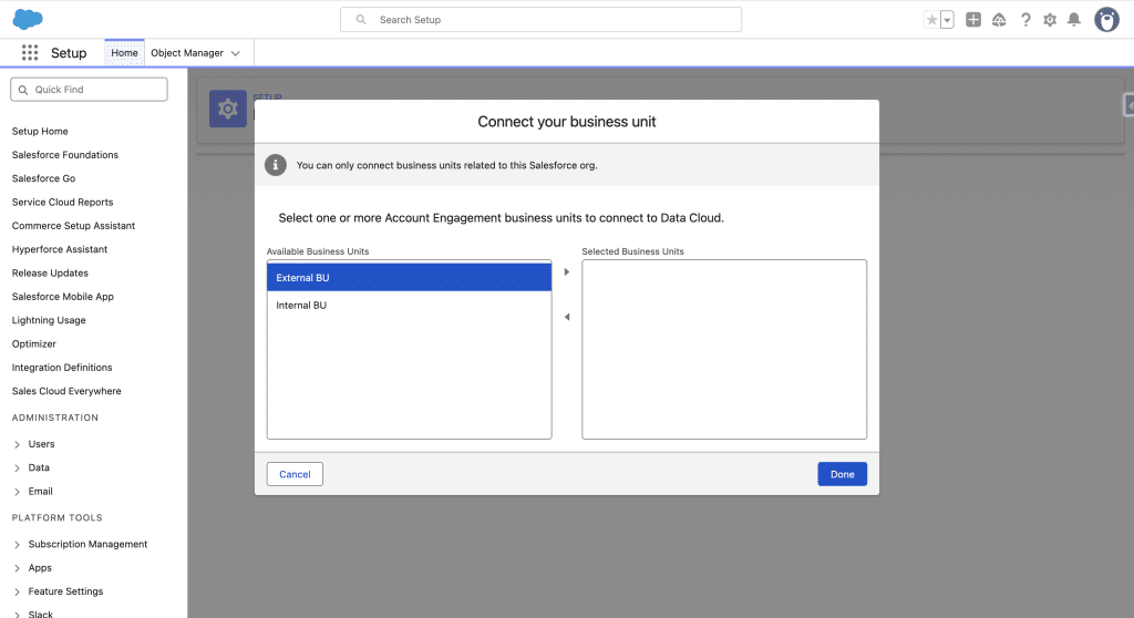 • On each selected Account Engagement Business Unit, the Data Cloud – Account Engagement Connector now dsiplays “Connected” (it was Disconnected before the previous step)
