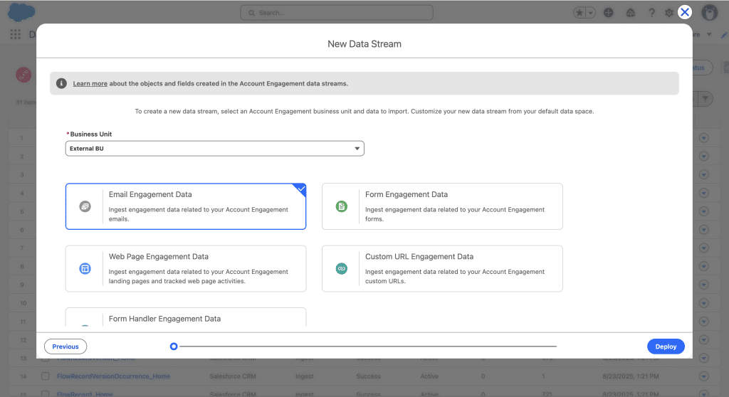 Then click Deploy. This will create a Data Stream called EmailActivity_xyz. You need to create the other DSO for each of the Business Units you created in the first step. So eventually, for a given Pardot Business Unit you will install 5 Data Streams: