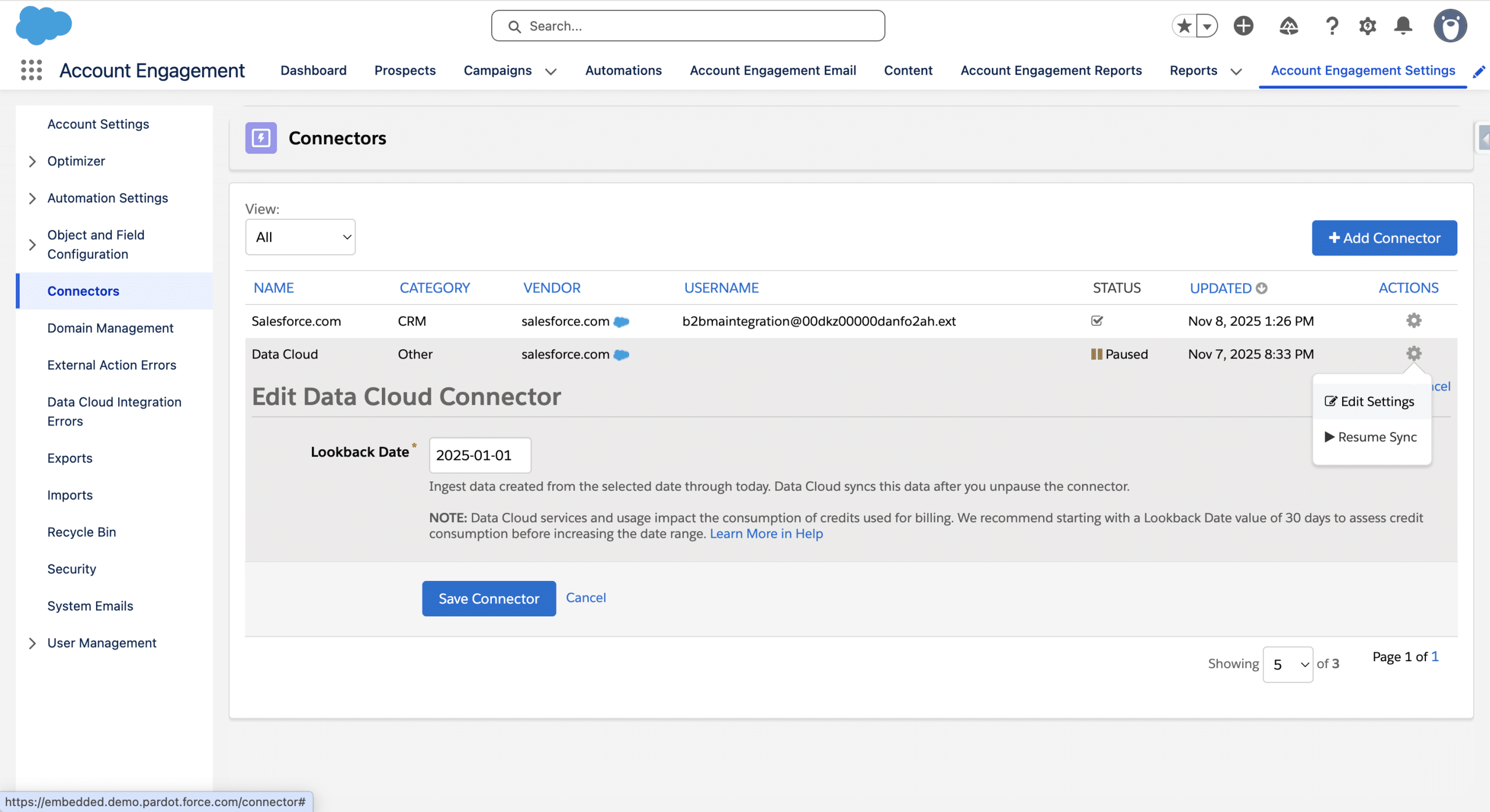 We need to perform a final step for your Account Engagement Prospects’ activity data. In each Account Engagement Business Unit you selected and installed the Data Streams for previously, go to Account Engagement Settings > Connector. The Data Cloud Connector should be in a Pause Status. Click Edit Settings.