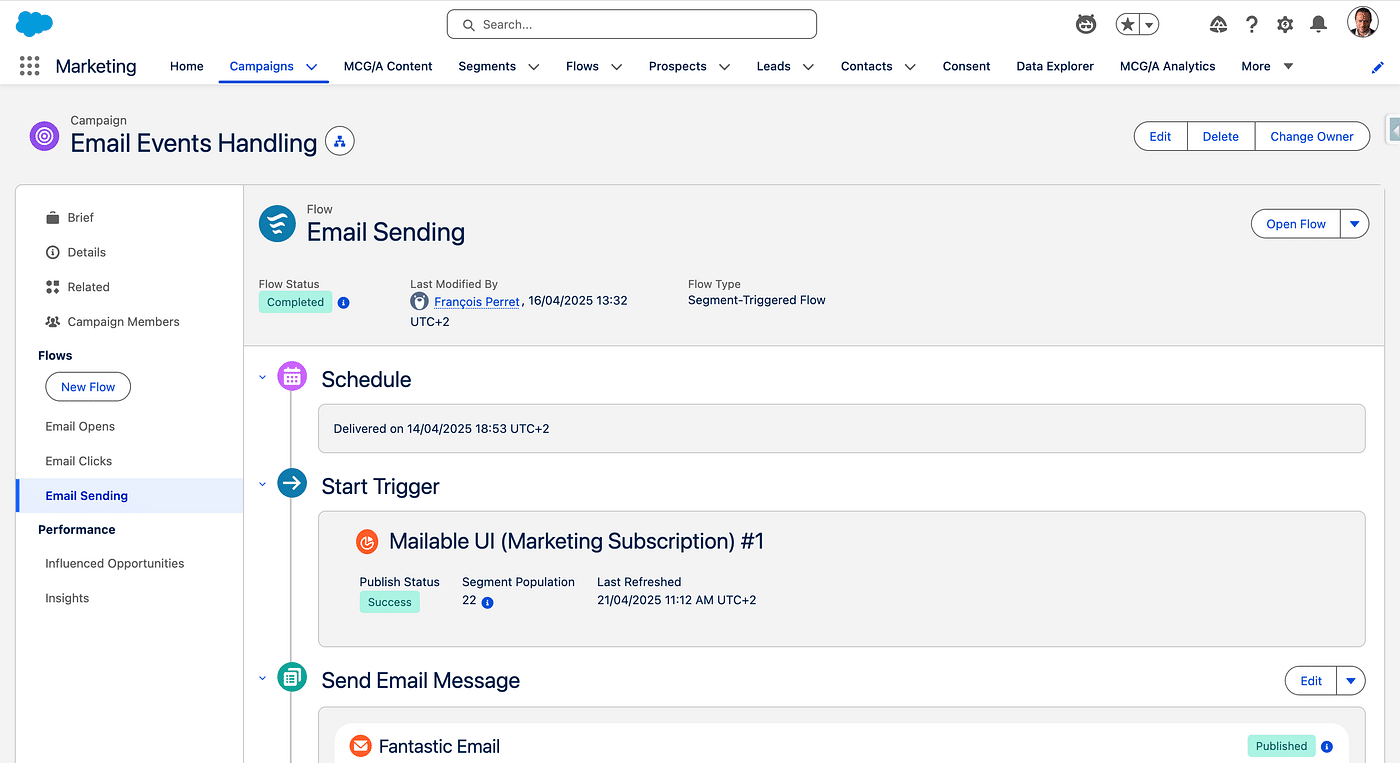 - Engagement Studio: well, Flows rule in Marketing Cloud Next. You can do pretty much everything you want there (send Emails, add Campaigns, wait for an event, etc.). The most similar type of Flow is the Segment Triggered Flow. See Campaign Management in Segment Triggered Flows for an example and best practices (“no pink in loops”). They also introduce an explicit Exit Criteria (whereas Engagement Program can be implicitely exited by leaving the List) and Decision Splits are a powerful way to evaluate a context with multiple outcomes (not just yes/no as in Pardot).