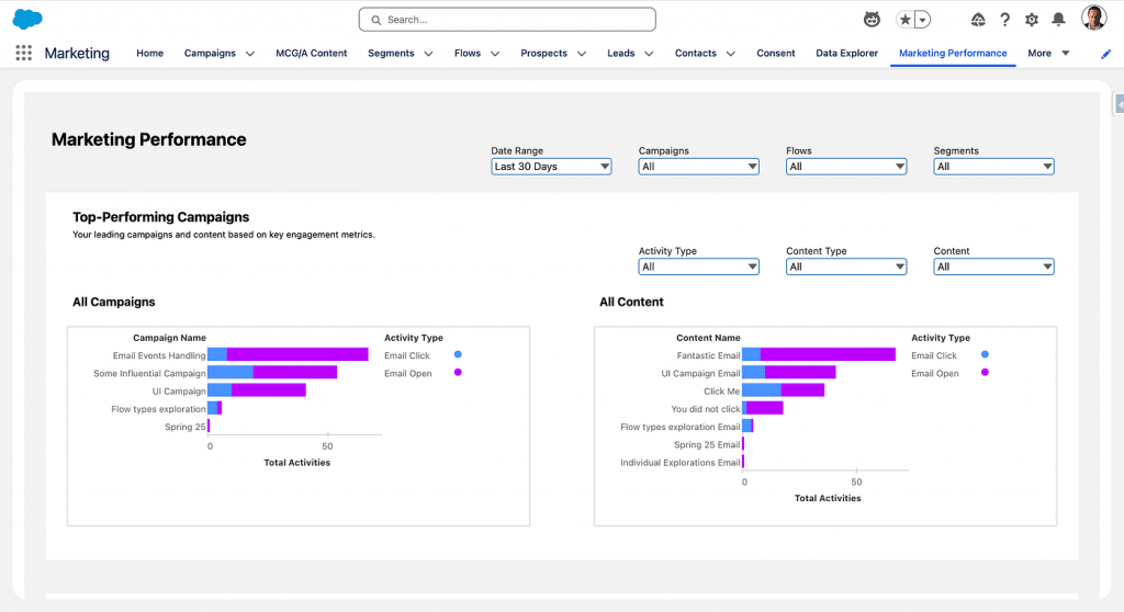Pardot makes reporting data available in Pardot itself, in Salesforce and in B2B Marketing Analytics, pre-made dashboards based in CRM Analytics. Also, Engagement History is a set of Fields and Widgets that can be added on Campaigns Layout for instance to display the Engagement performance. In Marketing Cloud Next (Growth & Advanced), Marketing Performance gives access to Engagement metrics, at the Campaign level or overall. All Data Cloud DMOs (see Data Cloud survival guide for Marketers) can also be seen as Reports or as CRM Analytics lenses, which can then be embedded in Dashboards.