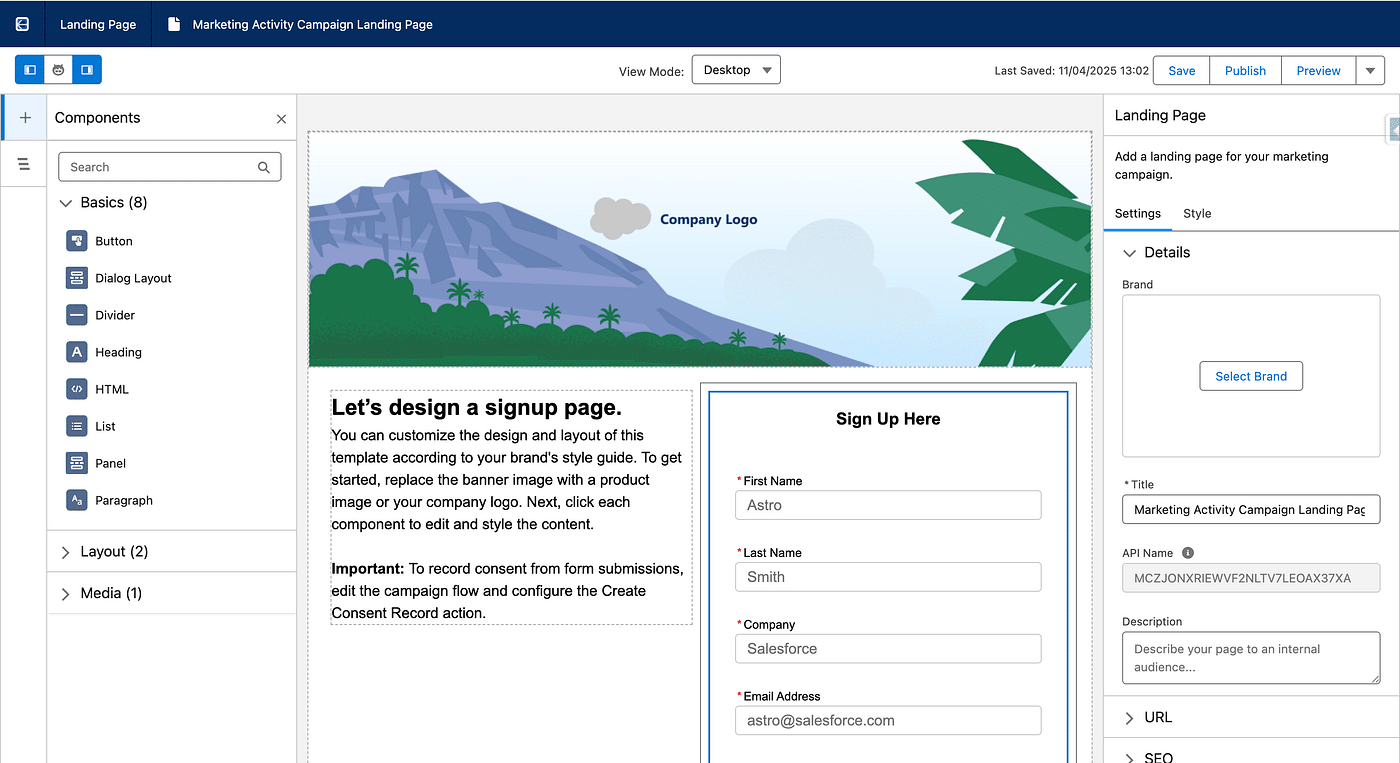 In Pardot you have Classic Landing Pages, and Lightning Landing Pages. In Marketing Cloud Next (Growth & Advanced), you use the standard Builder, identical to the one for editing Emails. There is no Layout Template concept in Marketing Cloud Next, but Landing Pages can be cloned. Also note that these Pages are actually Experience Cloud’s pages of an internal site.