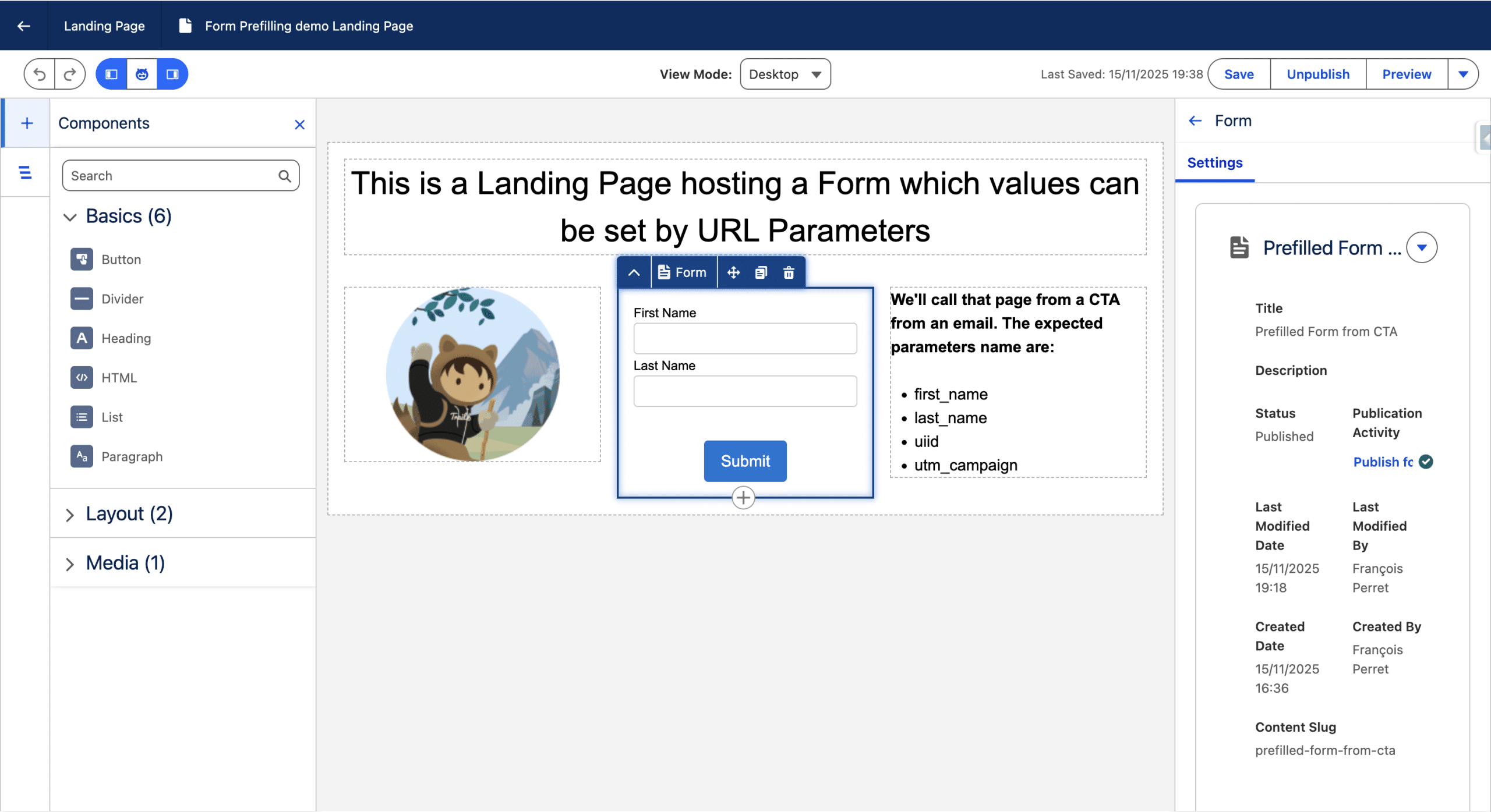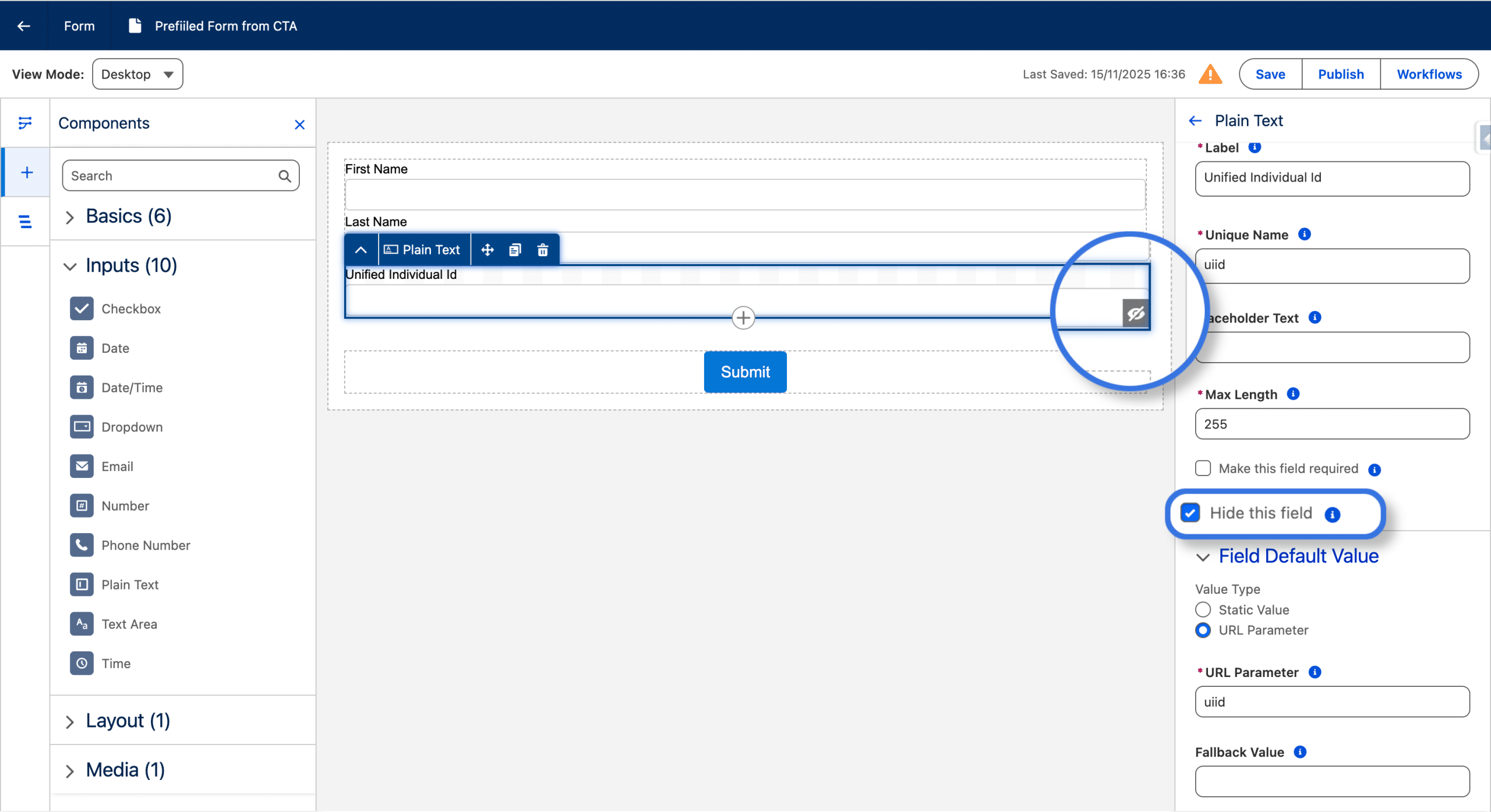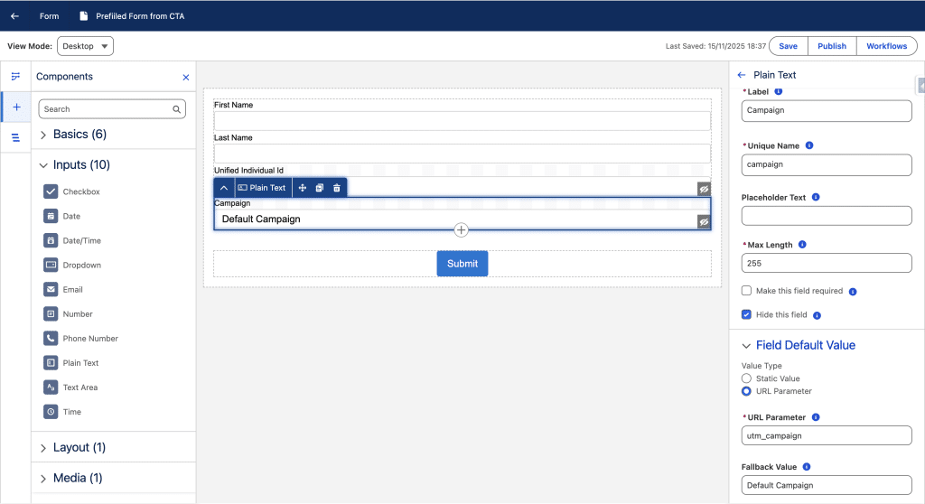 We’ll prefill the Form with the First Name and Last name of the recipient, and will also use the hidden Field feature, a new Form feature in winter ’26 to pass both the Unified Individual Id, and a Campaing name, using UTMs for that latter field