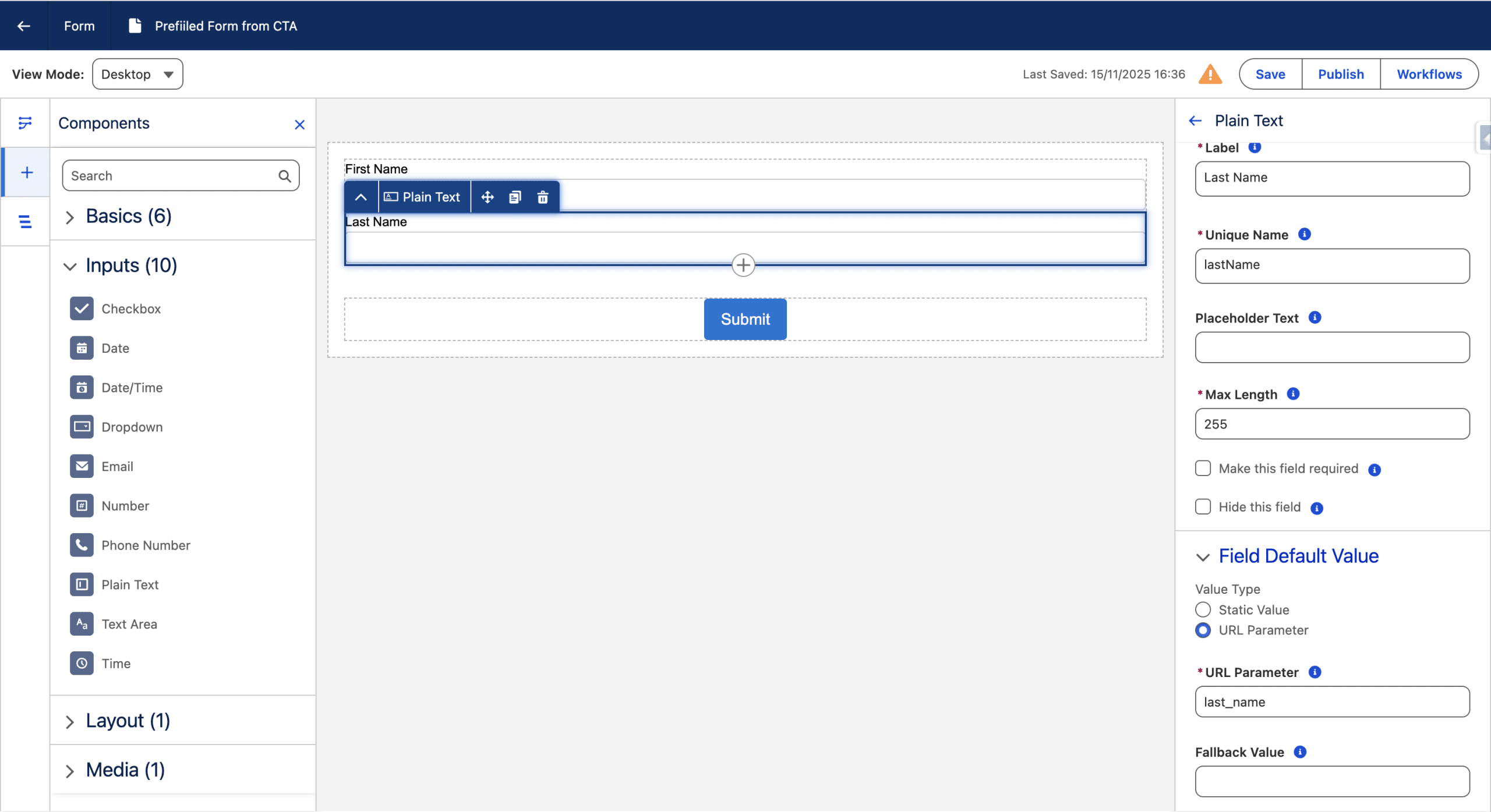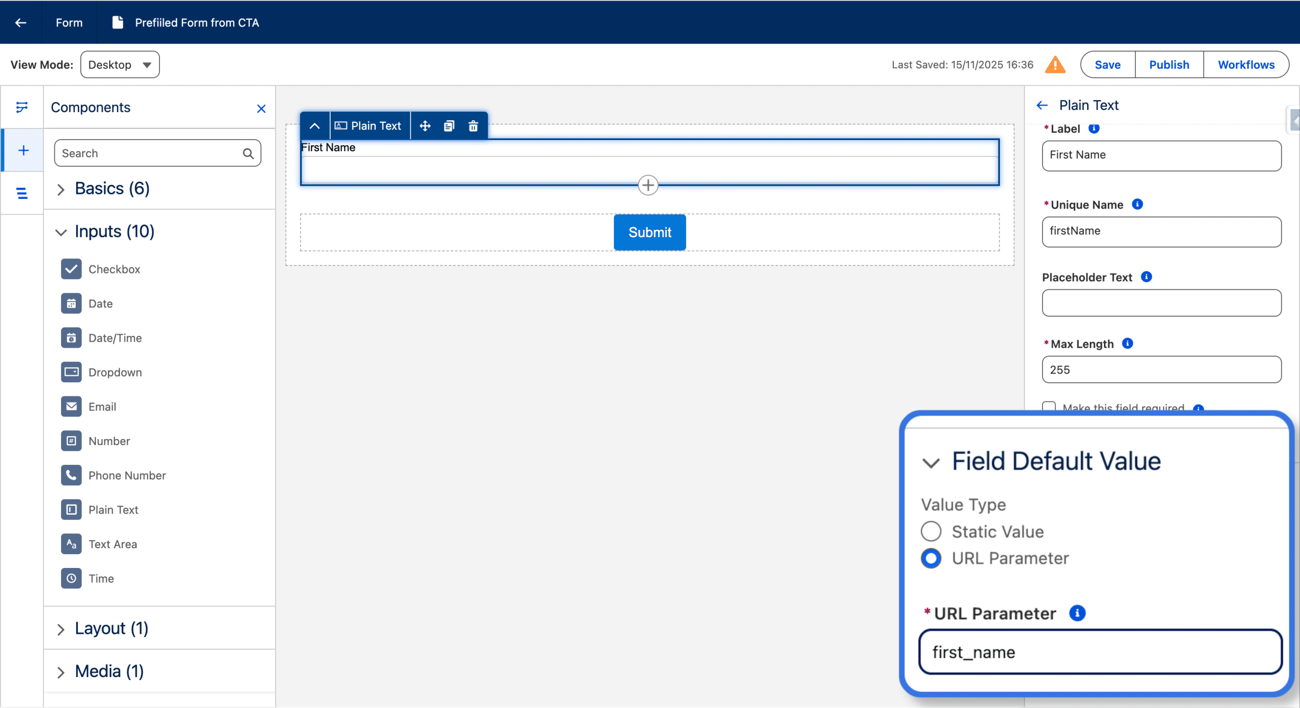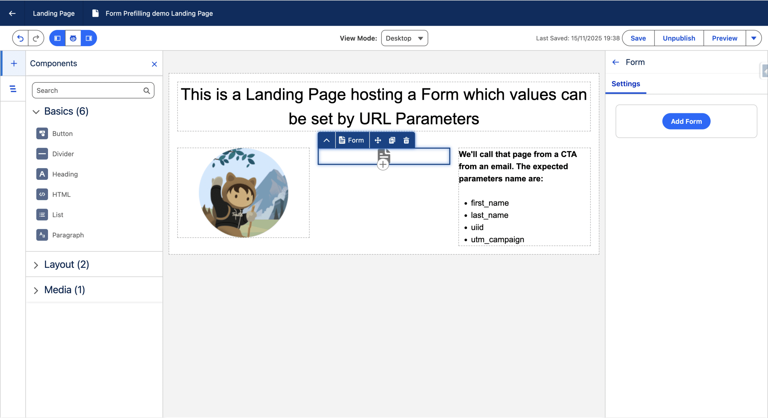 We’ll prefill the Form with the First Name and Last name of the recipient, and will also use the hidden Field feature, a new Form feature in winter ’26 to pass both the Unified Individual Id, and a Campaing name, using UTMs for that latter field