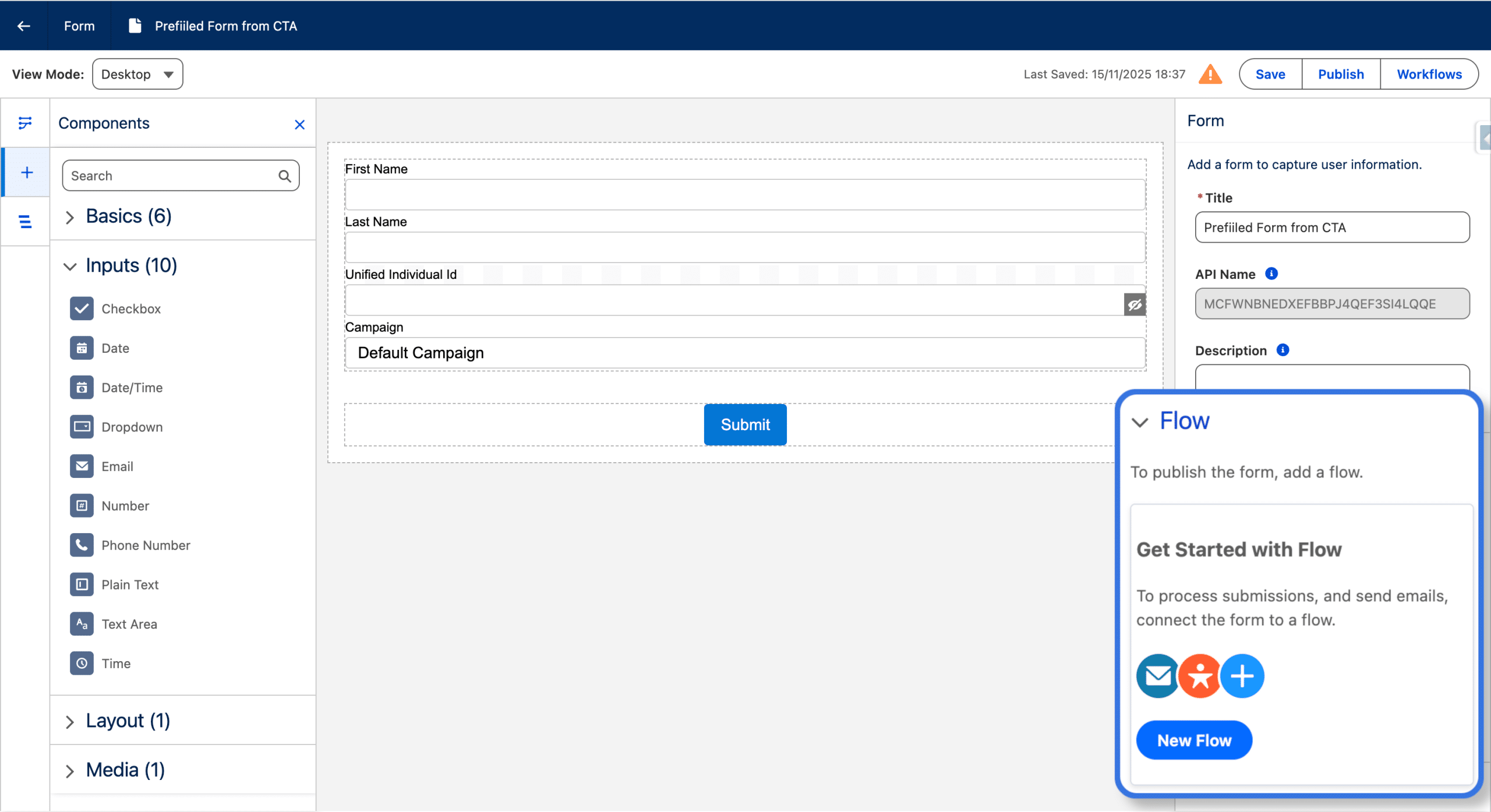 From a Campaign, a Signup Form Flow type, creates a Landing Page, including a Form and a Flow (related to the hosting Campaign) for use. In this article, we show the manual approach, and so we’ll create a Flow from the Form, using the New Flow button from the right sidebar.