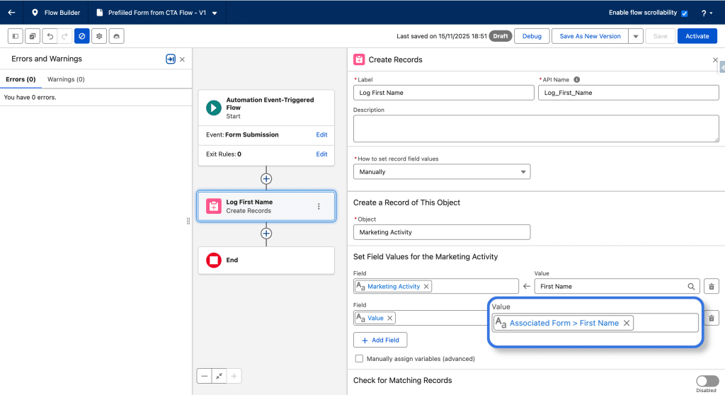 New Flow, then from the drop down, we select Open in Flow Builder (the Flow is in invalid state since it is empty). We could do whatever types of actions we want here, like sending an email (in that case a Create Record first element would be need or a use a subflow to do so.). Here, we’ll just log the values of the inputs’ form in a custom object (Marketing Activity).