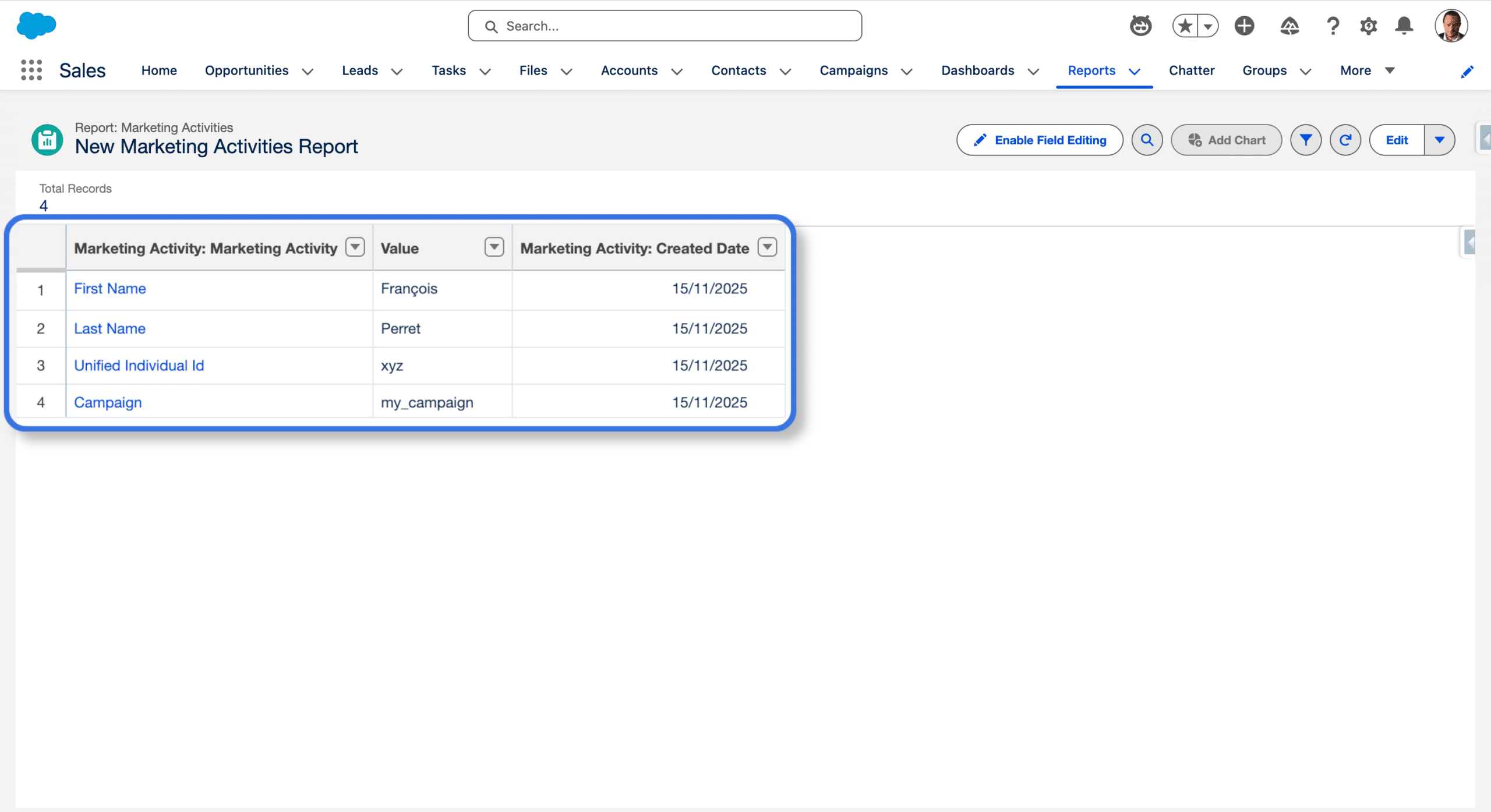 Let’s now Submit the Form. As we stored the hidden fields values as as well in our Marketing Activity Log object, we can see in a report that this fields are also filled with the passed values from the parameters once the Form was submitted.