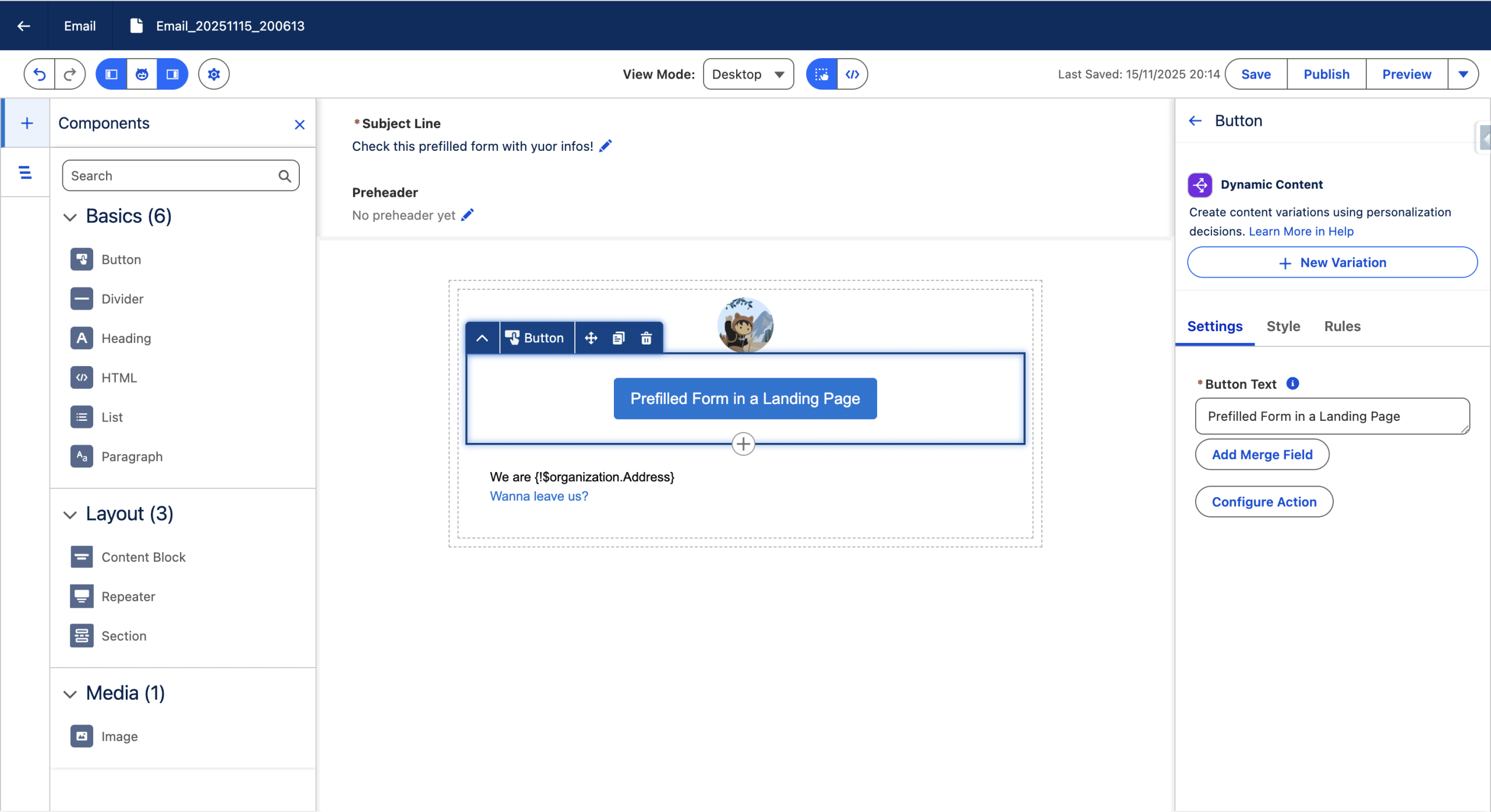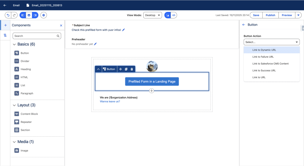We create our Email from ths CMS, Add Content > Email > Use Component, and define a Subject line for our email. We add a paragraph with our company address and an unsubscribe link. Then we add a Button component.