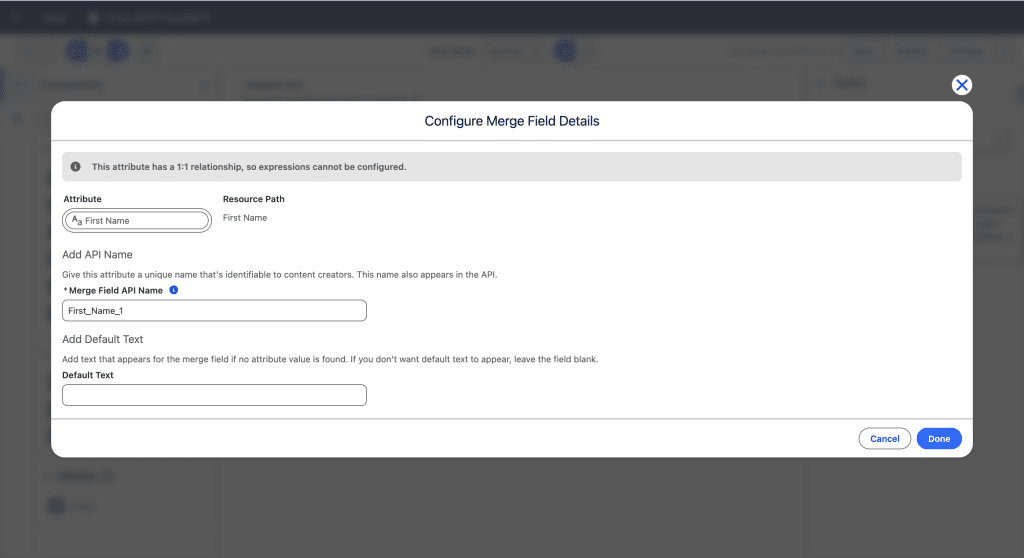 The values of the parameters in the URL will be sourced from the Data Graph. It can be any value directly or indirectly related to the Unified Individual, as long as it its avaliable in the default Data Graph defined for Agentforce Marketing. Here we will add the First Name value. Click Add Merge Field > Select Data Graph attribute> Primary Object > First Name.