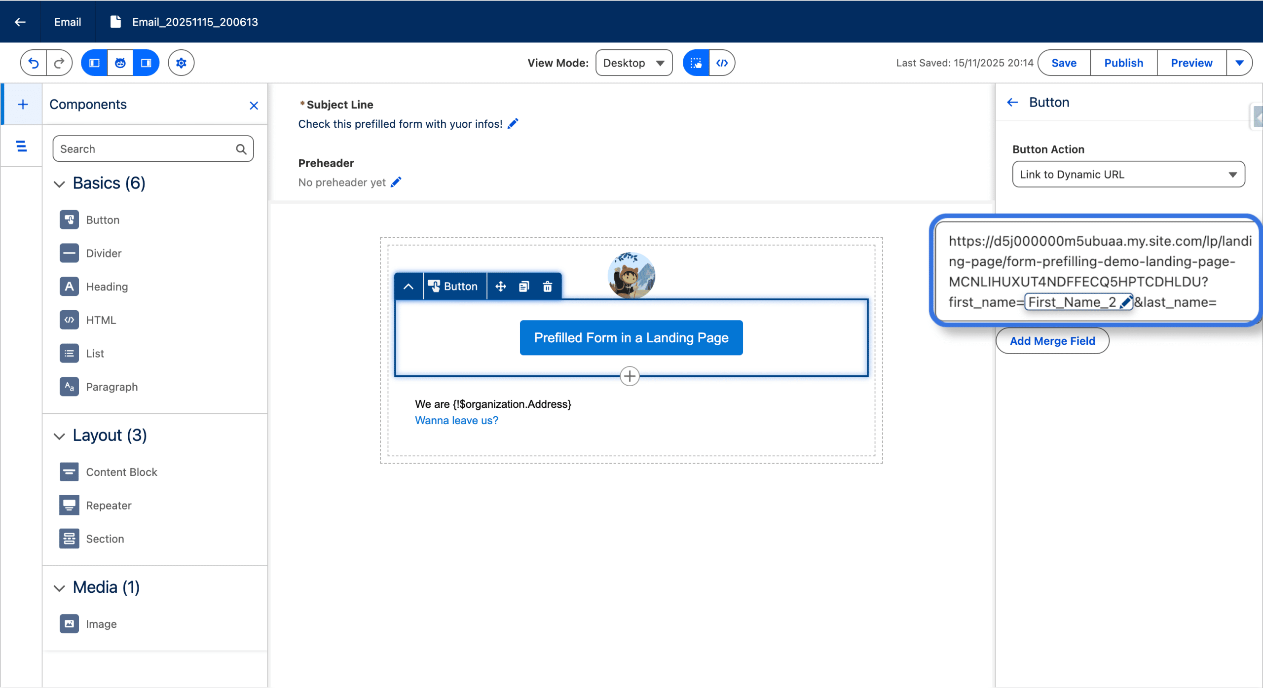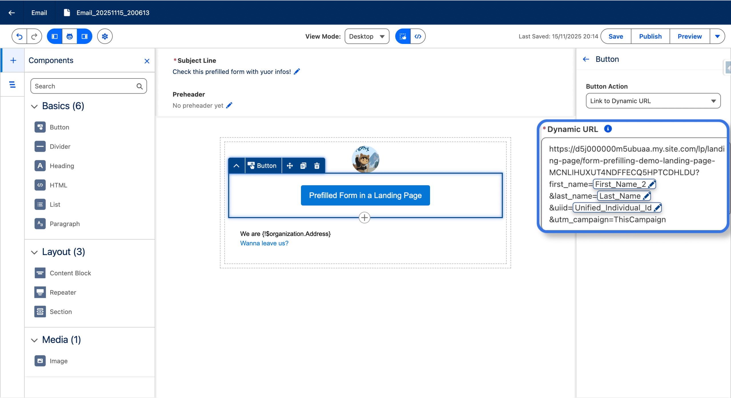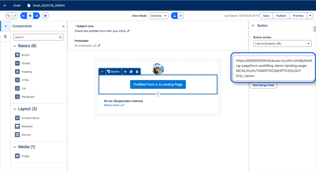 We’ll leverage the URL Parameter Field Default Value a new feature (winter ’26) of MC Next, to add the informations we know when a Prospect opens a Landing Page from an Email Call to Action.