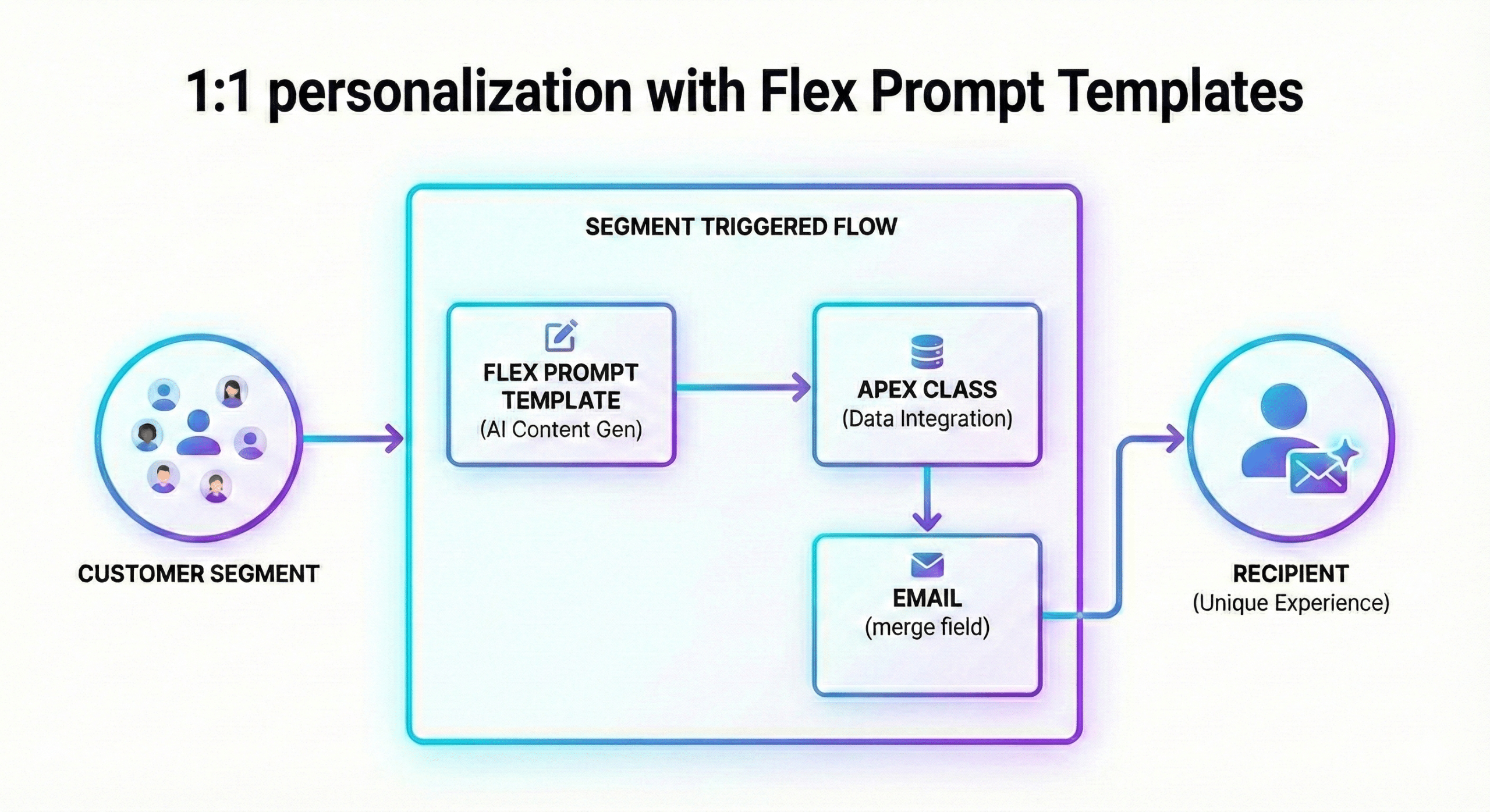 In this article, we’ll use Flex Prompt Templates from Agentforce to dynamically (that is at send time) generate email content. We’ll call the Prompt from a Flow and pass the AI generated outuput (grounded in recipient’s data) using the Apex Personalization we previously described to the email, which will then add it to the email as a simple Merge Field.