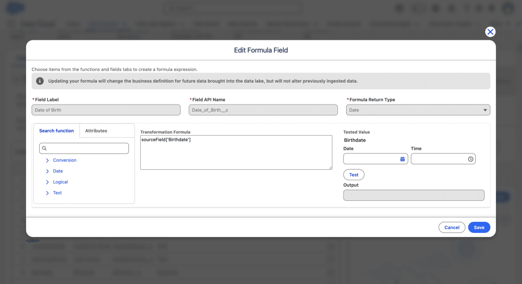 For this reason, and since we want to target only existing customers (that is Unified Individuals with at least one related Account_Contact), we’ll simply create a new Field we’ll call Date of Birth on the Account_Contact DMO and use it as a Segment criteria. First we create a Formula Field on the Contact_Home DSO, with the Date type, and use a formula Field to cast the initial Field into a simple Date.