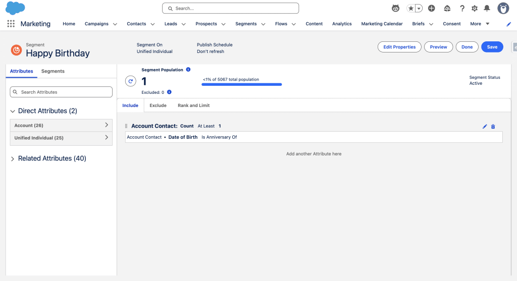 Next, we perform a Full Refresh on the Contact_Home DMO, so that our Formula Field is evaluated on each Contact, and so that our Field on the Account DMO is populated with a Date. In our Segment, we now drag our new Field and apply the “Is Anniversary Of” operator.